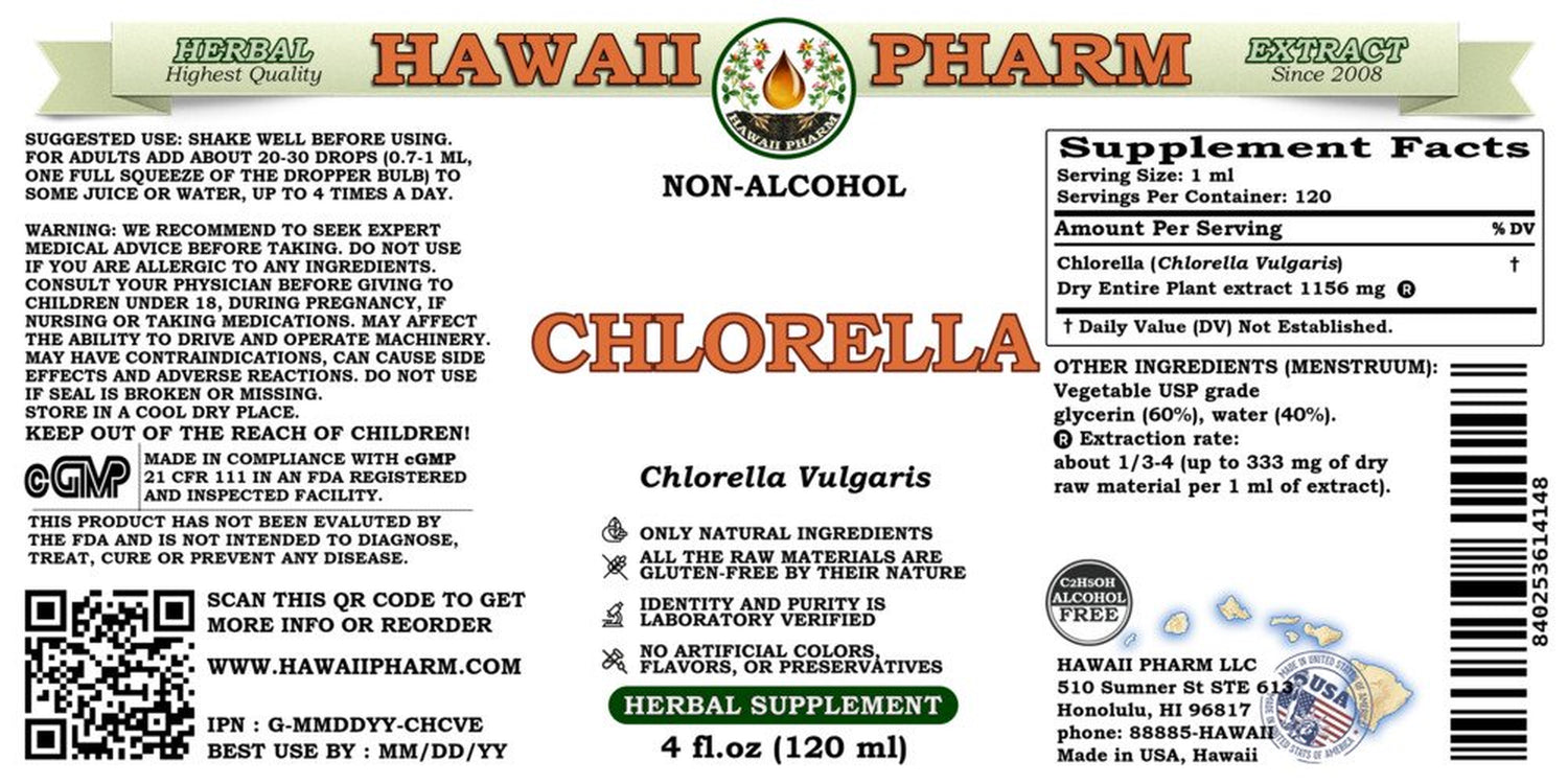 Product Name Chlorella (Chlorella Vulgaris) Dry Entire Plant ALCOHOL-FREE Liquid Extract. Expertly Extracted by Trusted HawaiiPharm Brand. Absolutely Natural. Proudly made in USA. Glycerite 4 Fl.Oz