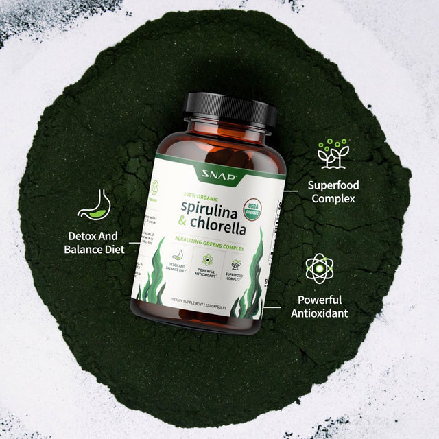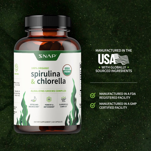 Snap Supplements Spirulina & Chlorella - Organic Heart Support & Natural Energy, 120 Capsules