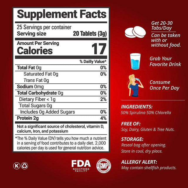 • NUTRIENT-DENSE SUPERFOOD: Our chlorella and spirulina tablets are here to help! Every serving of our Super 50-50 tablets is packed with as much protein as a steak and all the vitamins, minerals, amino acids, and fiber of a plateful of veggies. Plus, they are micronized for easy absorption, so you can trust that your body is absorbing all the goodness it needs.