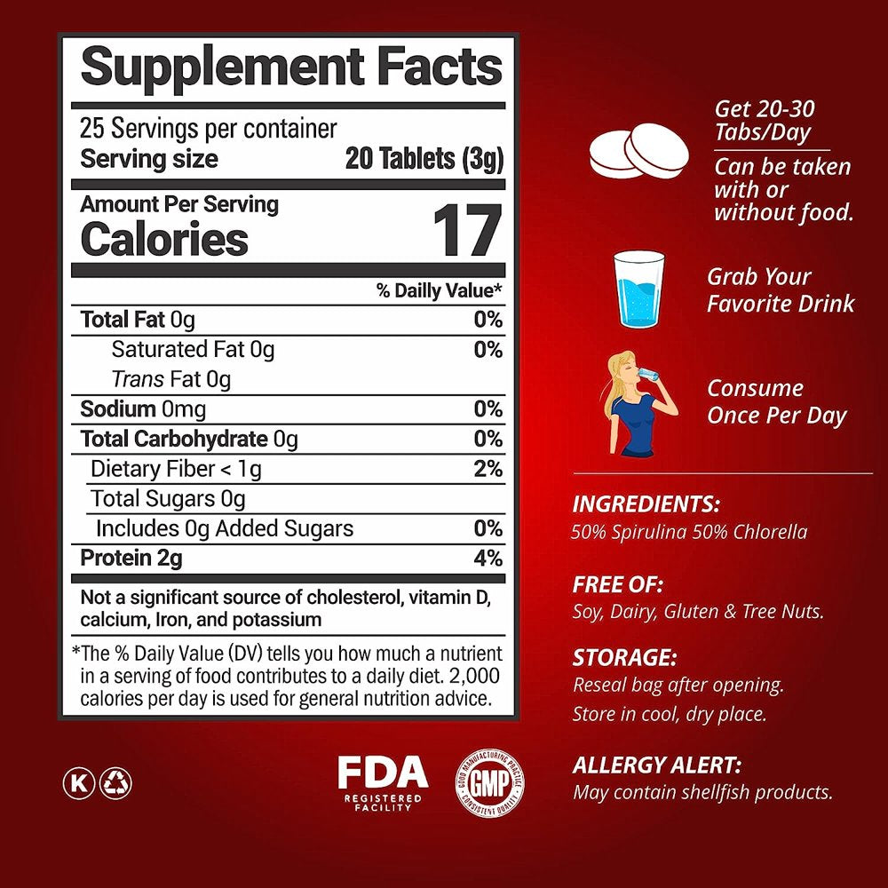 - NUTRIENT-DENSE SUPERFOOD: Our chlorella and spirulina tablets are here to help! Every serving of our Super 50-50 tablets is packed with as much protein as a steak and all the vitamins, minerals, amino acids, and fiber of a plateful of veggies.