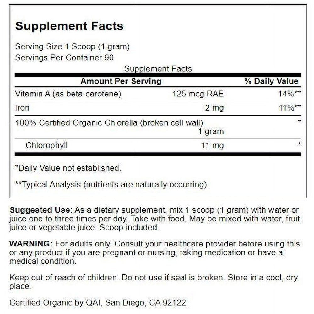 Those who rely on the amazing nutritional powerhouse that is chlorella know how important purity can be. This single-celled microalgae requires great care to produce a safe and wholesome supplement. Our Certified Organic Chlorella delivers with organic purity guaranteed. Like our other high-quality chlorella products, the cell wall is broken to ensure release of all important nutrients, including 11 mg of chlorophyll per serving. Rest assured, we stand behind the quality of all Swanson chlorella products, but for the growing number of customers making the conscious choice to seek out and support organic foods, we're pleased to offer this alternative.