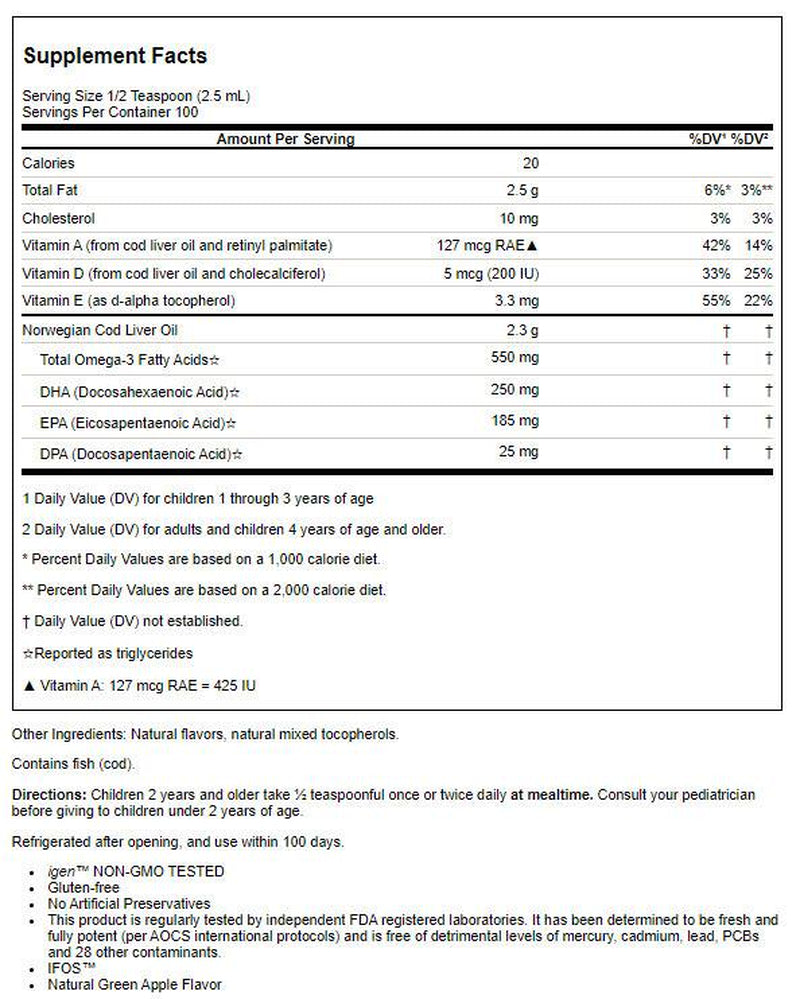 Carlson for Kids Norwegian Cod Liver Oil in natural green apple flavor has received numerous awards for its taste and quality. A single 1/2 teaspoonful provides 550 mg of omega-3s, including EPA and DHA, which support heart, brain, and immune system health. To ensure maximum freshness, Kid's Cod Liver Oil is closely managed from sea to store. We source the highest quality Arctic cod off the coast of Norway using traditional, sustainable methods. The same day they're caught, our cod are transported to a highly regulated Norwegian facility for processing and purification. Kid's Cod Liver Oil is bottled with a touch of vitamin E and is given a nitrogen flush to remove oxygen and prevent oxidation. Like all Carlson omega-3s, freshness, potency, and purity are guaranteed.
