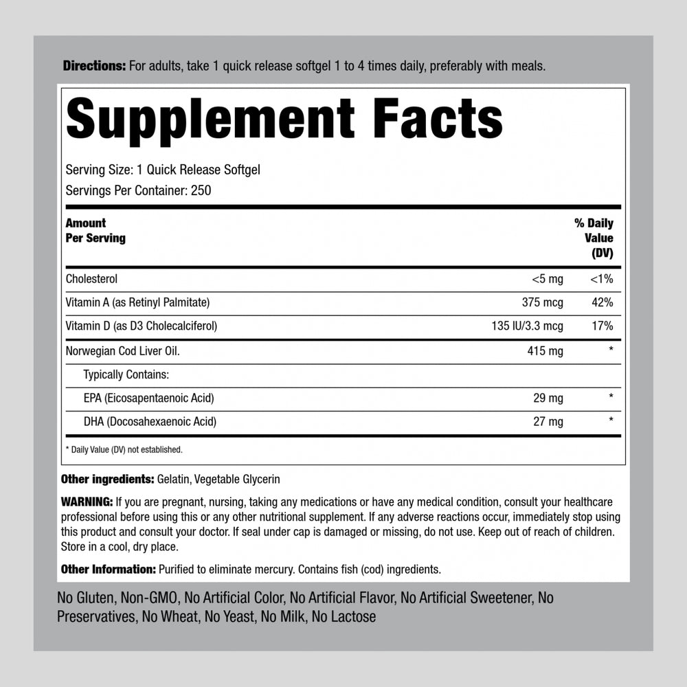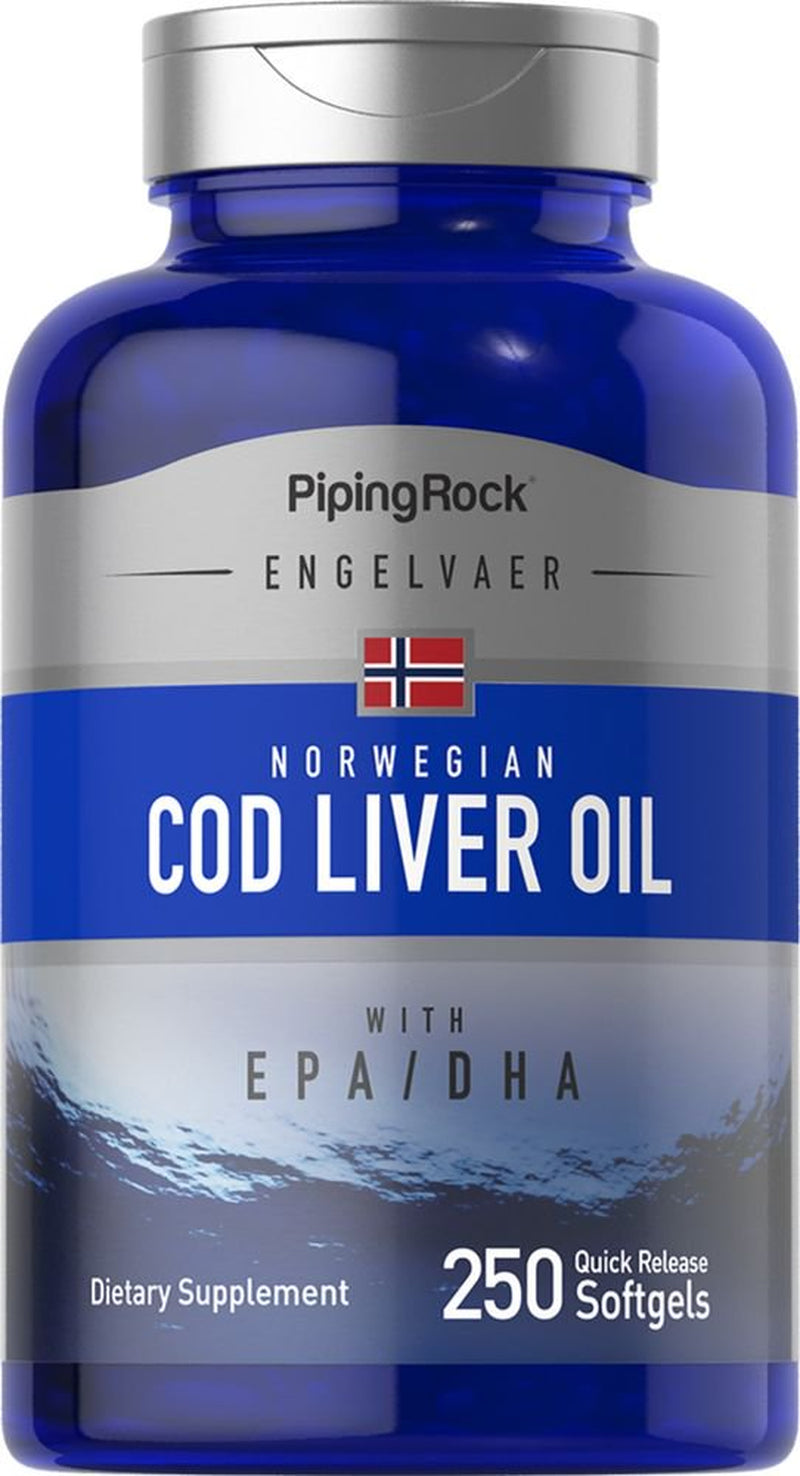 Cod liver oil is a remarkable superfood loaded with Omega-3 fatty acids, vitamin A and vitamin D. PipingRock is proud to offer you our Engelvaer Ultra Norwegian Cod Liver Oil -- a superior-quality formulation sourced from clear waters off the islands of Norway. Purified to remove mercury, our cod liver oil presents all the advantages of one of nature's greatest superfoods in each easy-to-swallow quick-release softgel!