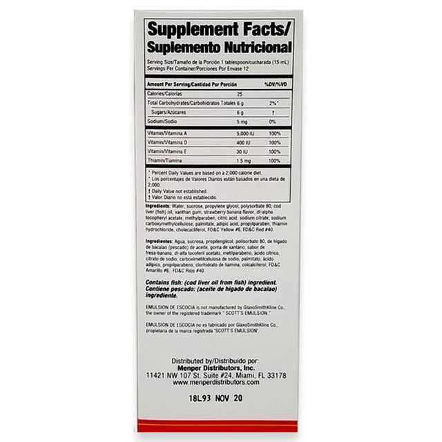 Emulsion De Escocia. Cod Liver Oil Dietary Supplement. Rich in Vitamins A, D, E and B1. Strawberry & Banana Flavour. 6.5 Fl.Oz. Pack of 3