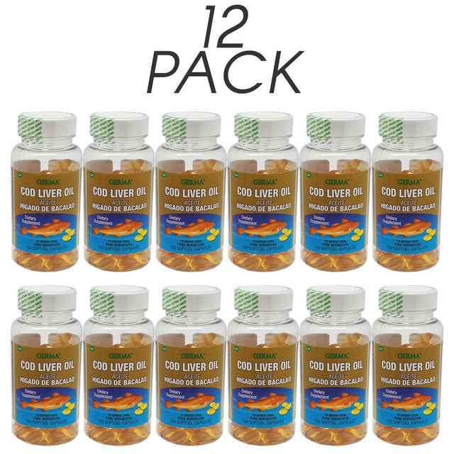 Germa Cod Liver Oil Natural Dietary Supplement. Improves Cognitive Peformance & Joint Health. 100 Capsules. Pack of 12
