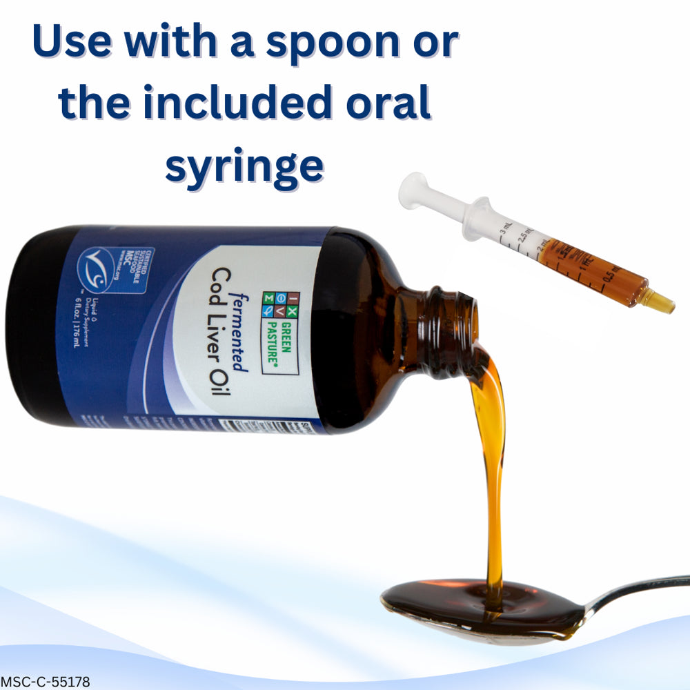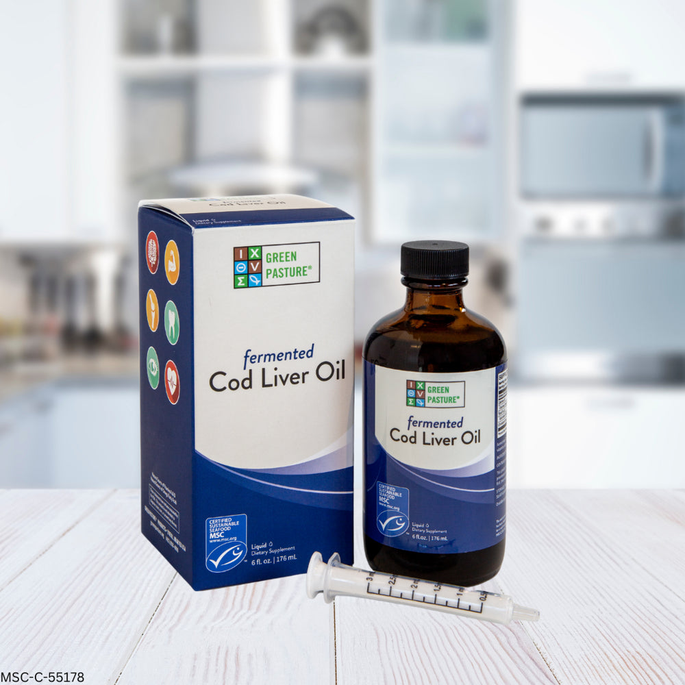 •Our Fermented Cod Liver is a source of Omega 3, Omega 6 and Omega 9 as well as Vitamin A & Vitamin D that are naturally occurring and benefits the whole family. •Green Pasture fermented cod liver liquid, is also available as a capsule. This fermented cod liver oil is a liquid that you can use a syringe or spoon to take daily. Temperature stable to store in cabinet or refrigerator. Green Pastures cod liver oil is not heated nor does it contain synthetic vitamins. Fermented Cod Liver Oil from Green Pasture is Sustainably Sourced from the Bering Sea near Alaska by Alaskan Leader Seafoods. MSC Certified