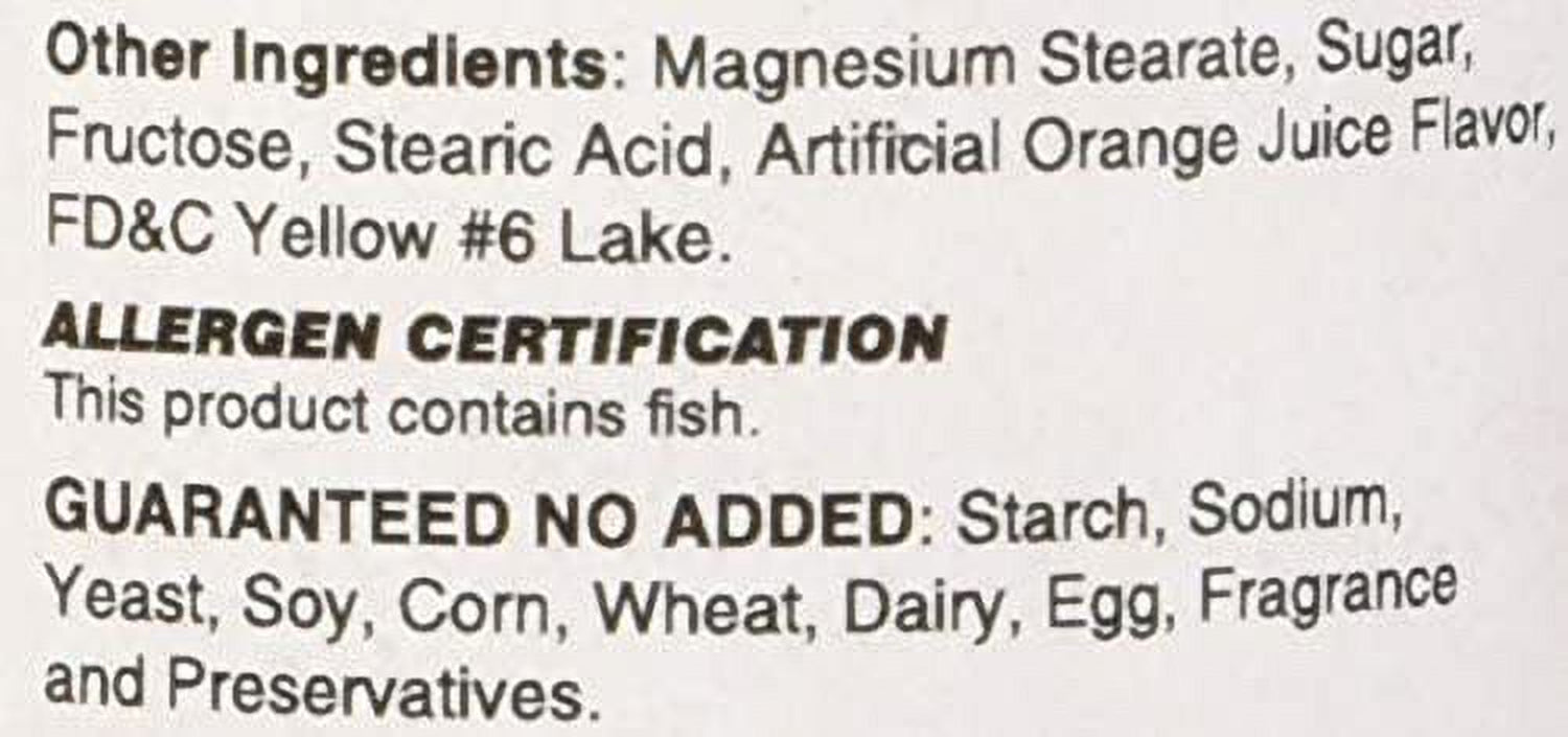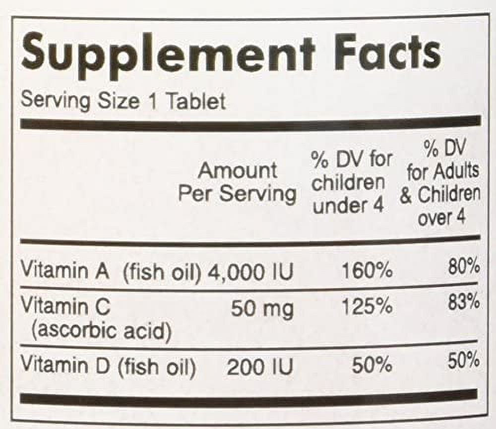 • The vitamin marketing experts. Active Ingredients: 1 Tablet: Vitamin A (Fish Oil) 4000 IU; Vitamin C (Ascorbic Acid) 50 mg; Vitamin D (Fish Oil) 200 IU; Magnesium Stearate; Sugar; Fructose; Stearic Acid; Orange Juice Flavor; FD&C Yellow #6 Lake Uses: Supports healthy immune system, blood pressure, heart, brain, joints and skin.* For children and adults. Guaranteed no added: starch, sodium, yeast, soy, corn, wheat, dairy, gluten, egg, fragrance and preservatives.
