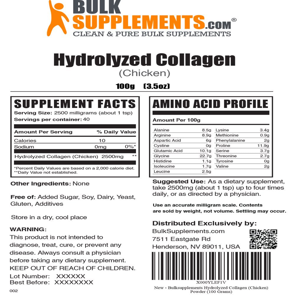 Bulksupplements.Com Hydrolyzed Collagen (Chicken) Powder - Keto Collagen Powder - Collagen Peptides Powder for Women - Pure Collagen (100 Grams - 3.5 Oz) - 100 Grams (3.5 Oz) is backordered and will ship as soon as it is back in stock.