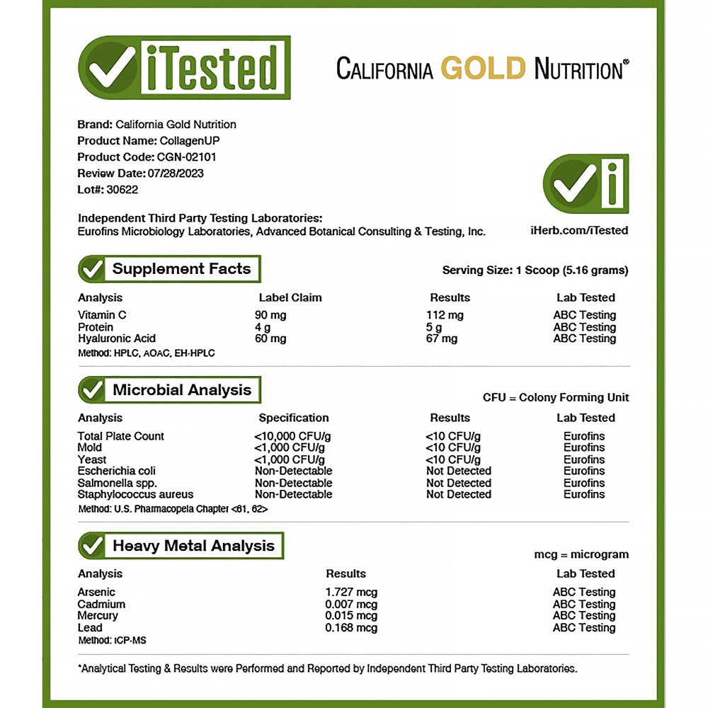 California Gold Nutrition CollagenUP, 2.2 lbs Marine Sourced Collagen Peptides + Hyaluronic Acid + Vitamin C Featuring Unflavored, Non-Bovine, Hydrolyzed Fish Collagen With Non-Animal Source Hyaluronic Acid and Vitamin C Upgraded Support for Healthy Hair, Skin, Nails, Joints and Bones* Enzymatically Hydrolyzed Collagen Broken Down into Bioavailable Peptides Formulated without Gluten, GMOs, or Soy Produced in a 3rd Party Audited cGMP Registered (Certified) Facility 100% Gold Guarantee Now in a Resealable Pouch for Easier Storage Collagen, hyaluronic acid, and vitamin C all contribute to the health and wellbeing of the musculoskeletal system. California Gold Nutrition CollagenUP contains all three of these ingredients to help support healthy hair, skin, nails, joints, and bones.* The unflavored powder can be quickly added to your favorite drink, providing a convenient way to add collagen to your diet. Types of Collagen Collagen is the primary structural protein found throughout the body and provides crucial infrastructure, both inside and out. There are many types of collagen that differ by how the molecules are assembled and where the collagen is used in your body. Our CollagenUP powder contains both type I and type III collagen, which are 2 of the 5 main types of collagen: Type I : This type of collagen makes up 80 to 90% of your body’s total collagen. Because it is densely packed, type I collagen provides structure to skin, bones, tendons, and ligaments. Type II : Found in elastic cartilage, such as knees and shoulders, this type of collagen provides support for joints. Type III : This type of collagen is commonly present with Type I and is found in muscles, arteries, and organs. Type IV : Found in the layers of your skin, type IV collagen helps support various functions of the skin. Type V : This type of collagen is found in the cornea of your eyes, bones, some layers of skin, hair, and tissue of the placenta. Plus Hyaluronic Acid and Vitamin C Our advanced collagen formula also includes two additional powerhouse ingredients – hyaluronic acid and vitamin C. Hyaluronic acid is a component of connective tissue and can provide the fluid matrix for joint lubrication, skin hydration, and repair.* Vitamin C plays a role in the production of collagen and assists in antioxidant protection.* Research suggests that regular consumption of these nutrients can provide the body with the fundamental building blocks that can help to support the health of joints, bones, skin, hair, and nails.* California Gold Nutrition CollagenUP features non-bovine, marine-sourced collagen peptides with hyaluronic acid and vitamin C. The specially processed fish collagen is enzymatically hydrolyzed (broken down) into low molecular weight component amino acid peptides in order to help ensure optimal absorption and bioavailability.* Typical Amino Acid Profile (mg) Per Serving^ Alanine 457 Hydroxylysine 57 Phenylalanine* 102 Arginine 475 Hydroxyproline 447 Proline 531 Aspartic Acid 277 Isoleucine* 57 Serine 225 Glutamic Acid 543 Leucine* 126 Threonine* 159 Glycine 1,071 Lysine* 189 Tyrosine 19 Histidine* 76 Methionine* 75 Valine* 101 ^May vary slightly from batch to batch*Essential Amino Acids iTested Verified