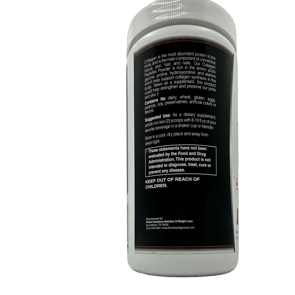 Grass-Fed and Pasture-Raised Chocolate Collagen Peptides. Provides 20g of Grass-Fed, Non-GMO bovine collagen peptides per serving in delicious chocolate flavor. No gluten, dairy, or soy. Collagen is the most abundant protein in the body and is the main component of connective tissue. It is the tough, fibrous protein in hair, nails, tendons, ligaments, and skin. Collagen helps preserve the elastin in the skin, helping it to stay toned and supple, and collagen also gives tendons and ligaments their toughness. As we age, our body begins producing less collagen, which is one reason why skin starts to sag and joints become achy. Our Collagen Peptides Powder is hydrolyzed and contains types 1 & 3 collagen which supports skin, muscles, and bone health.† Hydrolyzed collagen is easier to absorb, allowing the amino acids to be utilized more efficiently. Collagen Peptides Powder is rich in the amino acids glycine, proline, hydroxyproline, and alanine which help promote collagen synthesis in our body. Features * 20g Collagen Peptides per serving * Grass-fed & pasture-raised bovine collagen * Hydrolyzed type 1 & 3 * Collagen Non-GMO * Simple and Clean Ingredients * Delicious Chocolate Flavor (Also available in Vanilla and Unflavored) Benefits * Supports a healthy inflammation response.† * Supports joint function and mobility.† * May support health of the lining of the intestinal tract.† * Strengthens connective tissue and helps aid recovery from physical stress or trauma.† * Strengthens extracellular matrix and helps to form fibroblast to create new skin cells.† * Helps to strengthen and firm elastin in the dermis layer of skin, providing an anti-aging effect.† * Mixes instantly No Gluten, Dairy, or Soy No fillers or Artificial Ingredients post-workout. About us. Donovan and Cecilia Approved products use our strict and science-based approach to find clean supplements for your healthy lifestyle goals. † These statements have not been evaluated by The Food and Drug Administration. This product is not intended to diagnose, treat, cure or prevent any disease.