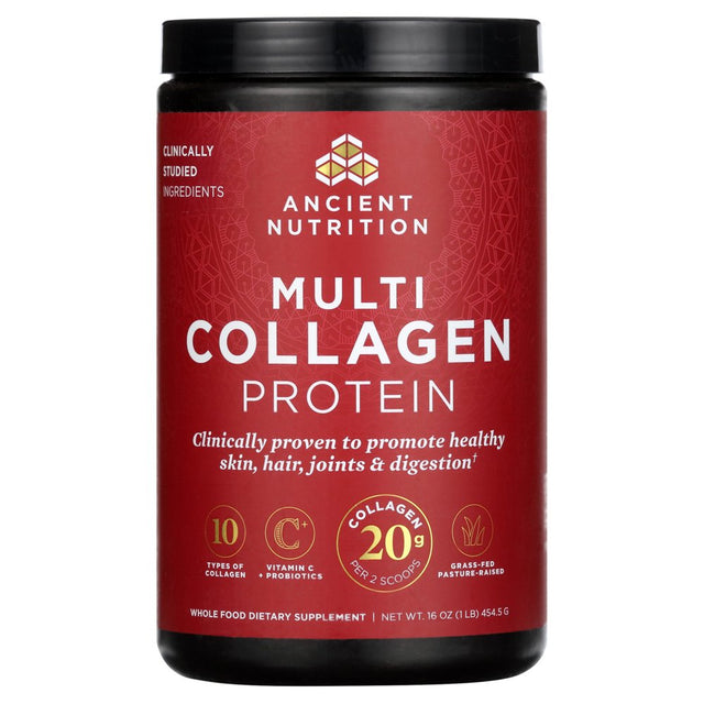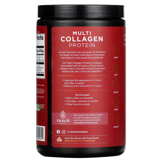 Clinically Studied Ingredients Dr. Axe Formula 5 Types of Food Source Collagen - Type I, II, III, V & X Vitamin C + Probiotics Collagen 20 g Per 2 Scoops Grass-Fed Pasture Raised Non GMO Whole Food Dietary Supplement Skin Gut Nails Hair Joints Clinically proven to promote healthy skin, hair, joints & digestion. Ancient Nutrition transforms your health and vitality with history's healthiest whole food nutrients. Our Multi Collagen Protein is uniquely formulated with 5 types of food source collagen that are clinically proven to promote healthy hair, skin, joints and digestion. Clinically-studied source of Types V and X collagen to improve crow's feet after 4 weeks. Clinically-studied source of Types V and X collagen to reduce joint discomfort in 7 days.