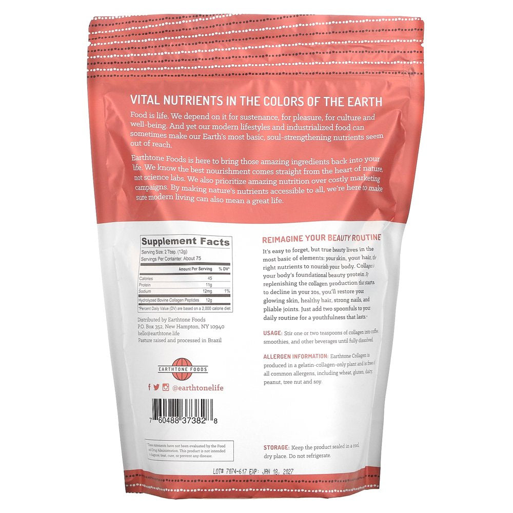 Earthtone Foods Grass Fed Collagen Peptides, Unflavored, 32 Oz (907 G)