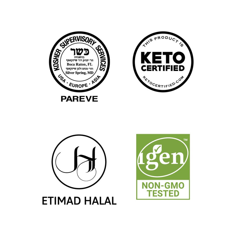 - Bovine Collagen Peptides, Non-GMO Tested, Kosher, KETO-Certified, Botanically Sourced Flavors & Colors, Gluten-Free, Glyphosate Free, Halal