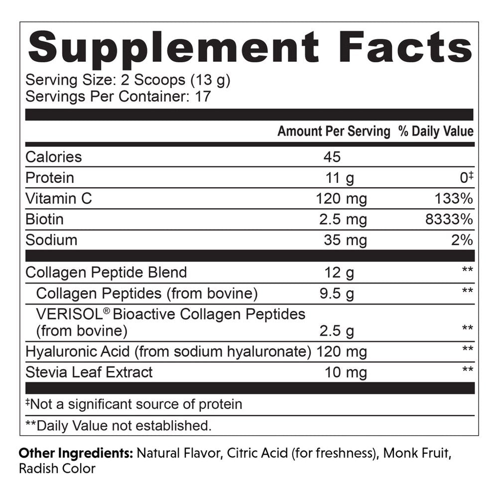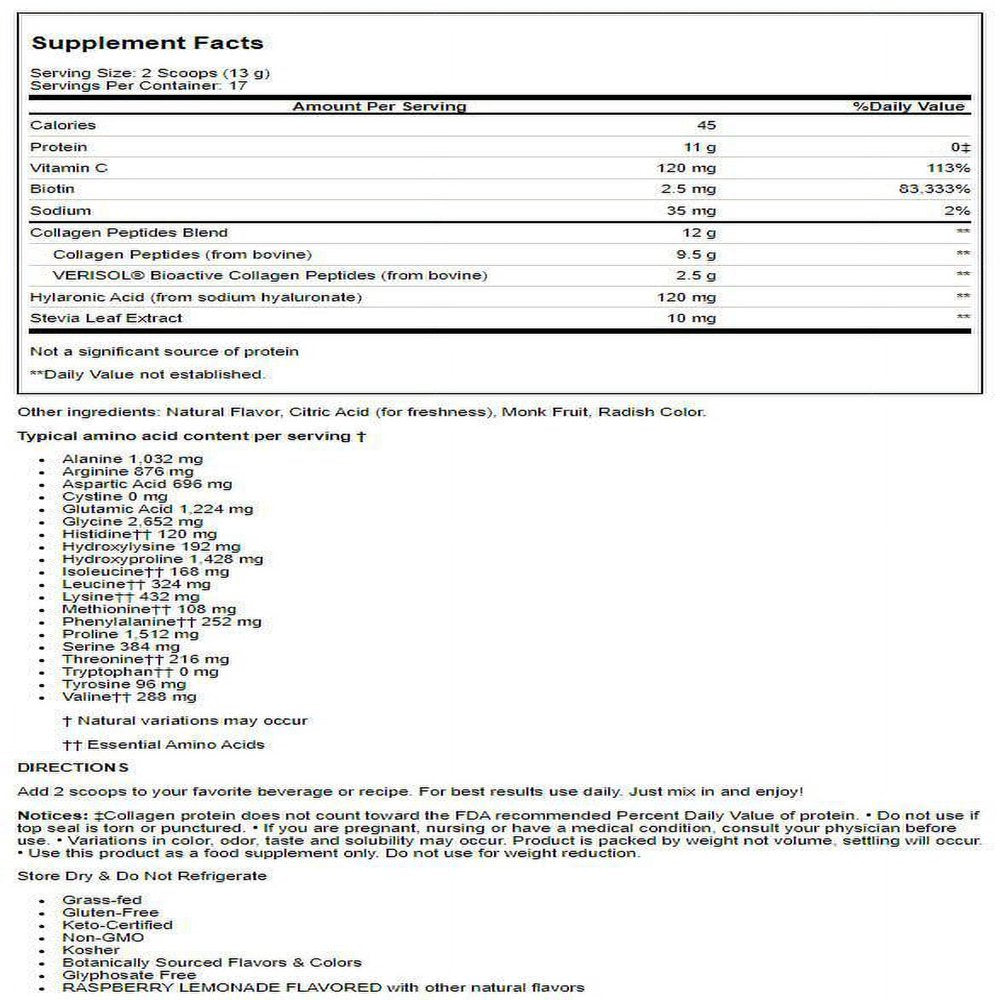 - 12 grams of raspberry lemonade flavored collagen peptides per serving