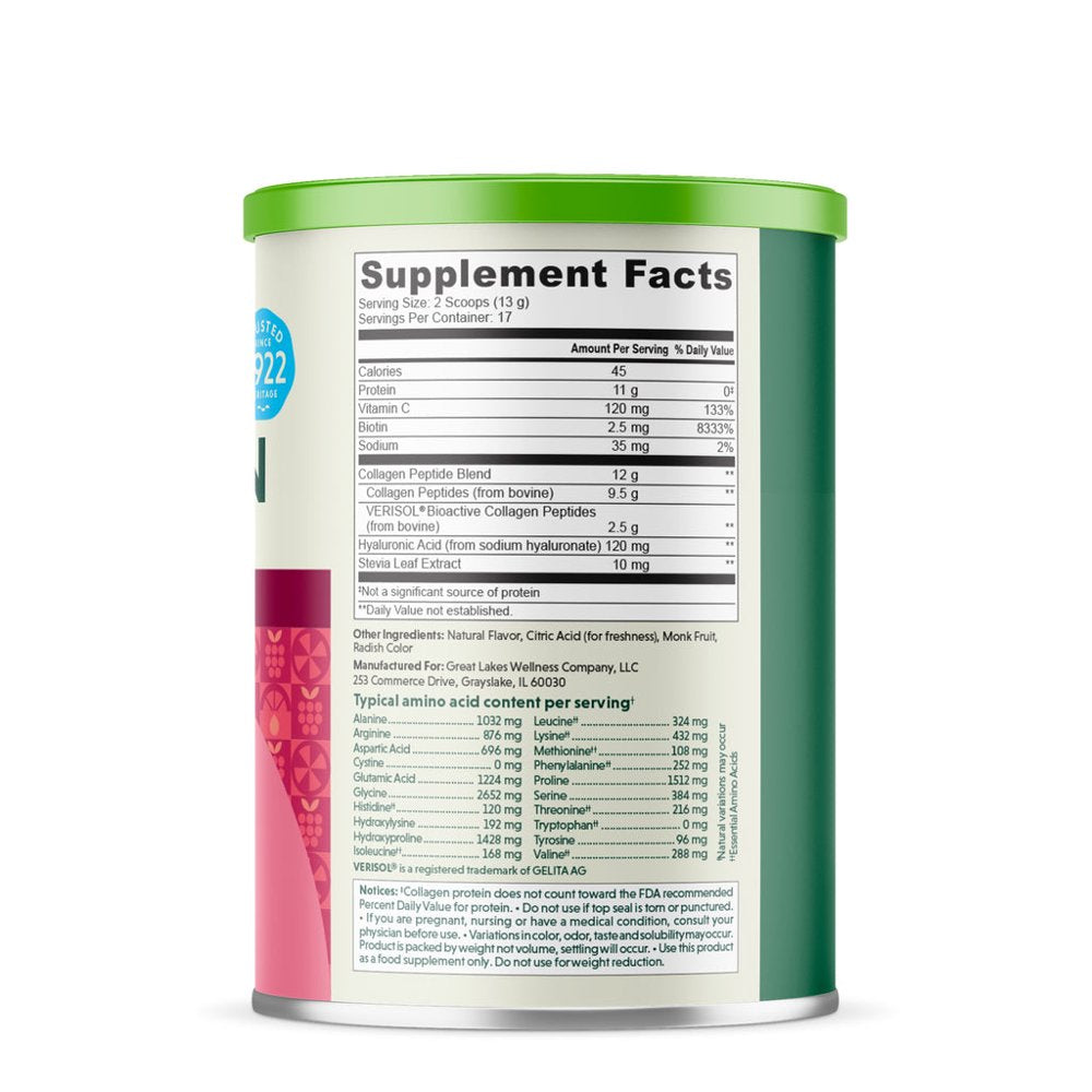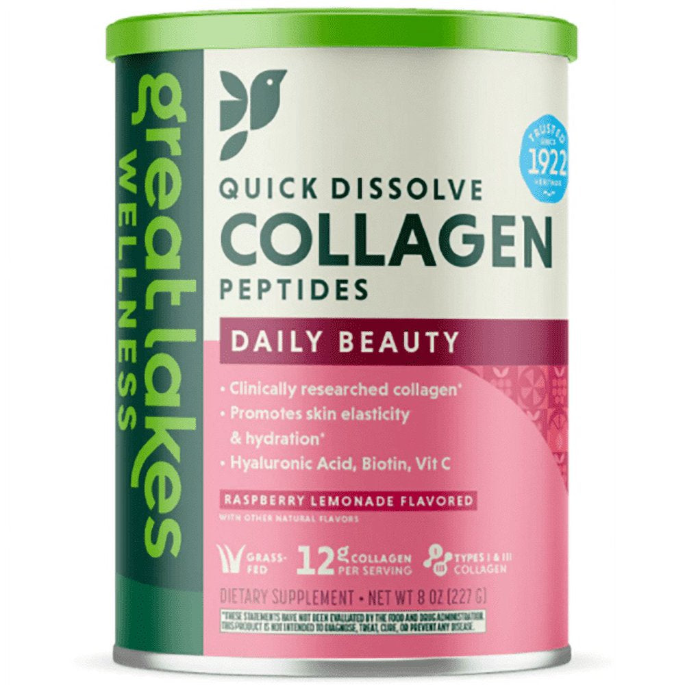 Great Lakes Quick Dissolve Collagen Peptides Daily Wellness Beauty Powder, Rise and find your morning glow. Daily Beauty grass-fed collagen includes a special formulation of clinically researched VERISOL® Collagen plus Hyaluronic Acid, Biotin, and Vitamin C to minimize the appearance of fine lines and wrinkles when taken daily. This delicious Raspberry Lemonade Collagen dissolves quickly into liquids and is easy to digest, guaranteed to be your favorite collagen beauty drink. Add 2 scoops to your favorite beverage or recipe, it's really that easy. Our products are formulated to taste great, dissolve quickly, and be so easy to use that you’ll want to enjoy them every day.