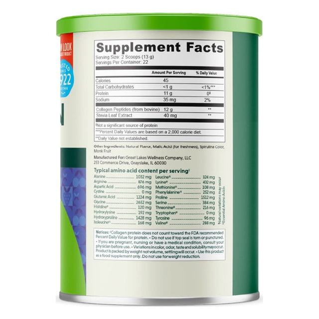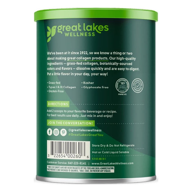 From a trusted name in collagen supplements comes a refreshing twist: Mixed Berry Flavored Quick Dissolve Collagen Peptides from Great Lakes Wellness delivers 12 g collagen from grass-fed and pasture-raised cattle plus a balanced amino acid profile. Collagen is an important protein that supports the health of connective tissues throughout the body such as skin, tendons and ligaments. Adding a collagen supplement to your daily routine can support healthy hair, skin, nails and joints. Lightly sweetened and flavored with botanically sourced ingredients, it dissolves easily in hot or cold beverages.