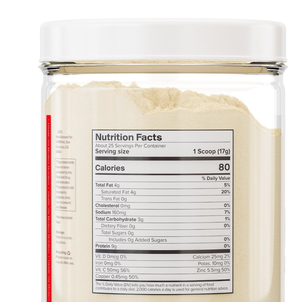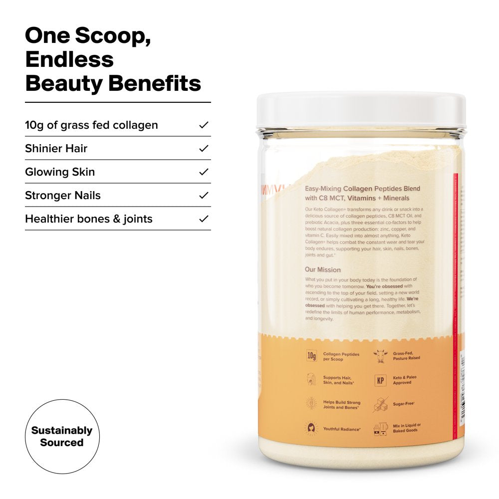 Enhanced Collagen Blend Naturally Flavored With Other Natural Flavors 10 g Collagen Peptides Grass-Fed Pasture Raised 5 g C8 MCT Oil Powder Supports Hair, Skin, and Nails No Gluten No Dairy No Sugar† Keto & Paleo Approved Helps Build Strong Joints and Bones Youthful Radiance Mix in Liquid or Baked Goods Easy-Mixing Collagen Peptides Blend with C8 MCT, Vitamins + Minerals Our Keto Collagen+ transforms any drink or snack into a delicious source of collagen peptides, C8 MCT Oil, and prebiotic Acacia, plus three essential co-factors to help boost natural collagen production: zinc, copper, and vitamin C. Easily mixed into almost anything, Keto Collagen+ helps combat the constant wear and tear your body endures, supporting your hair, skin, nails, bones, joints and gut. Our Mission What you put in your body today is the foundation of who you become tomorrow. You're obsessed with ascending to the top of your field, setting a new world record, or simply cultivating a long, healthy life. We're obsessed with helping you get there. Together, let's redefine the limits of human performance, metabolism, and longevity. 1 Net Carb (1g) = Total Carbs (3g) - Acacia (2g) †Not a low calorie food.