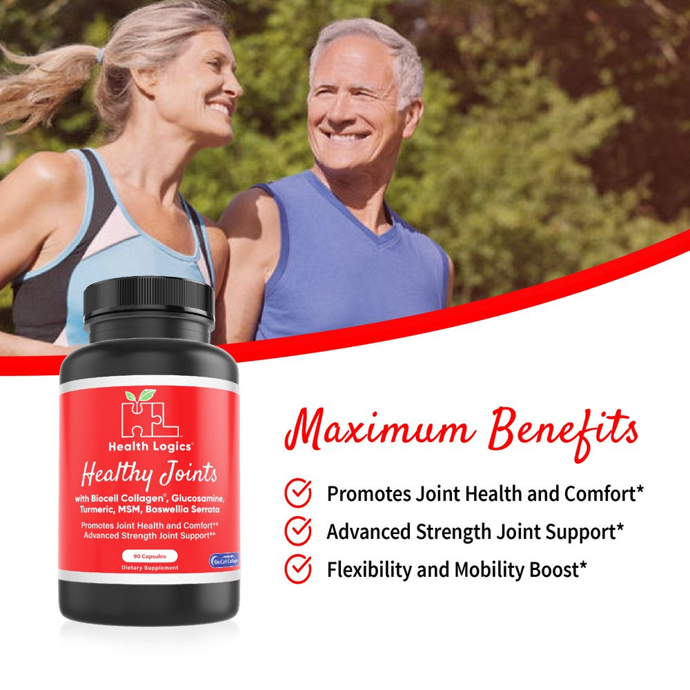 Health Logics Healthy Joints | Joint Supplement with Biocell Collagen, Glucosamine, MSM, Vitamin C, Turmeric Extract 95% Curcuminoids, Boswellia Serrata | Support Joint Comfort | Non-Gmo | 90 Capsules