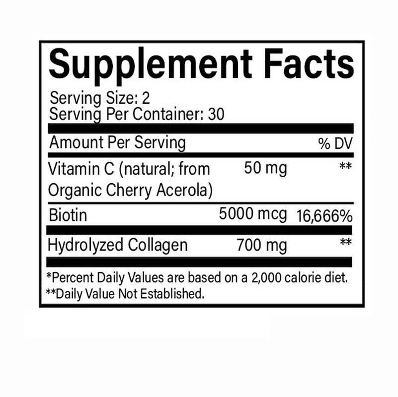 Biotin Is one of eight B Vitamins. It is also known as vitamin B-7 or vitamin H, in which case the H stands for “Haar und Haut,” the German words for “hair and skin.” Most people get the biotin they need from eating a healthy diet, but there have been many claims that getting more biotin can regulate your blood sugar, promote healthy hair, skin, and nails, and help pregnant moms have healthier babies. Biotin helps maintain many of your body’s major systems. Like other B vitamins, biotin helps your body use enzymes and carry nutrients throughout the body. Biotin helps the body convert food into energy — it supports a number of enzymes involved in the breakdown of carbs, fats, and proteins. Specifically, biotin is involved in: Gluconeogenesis: This is the synthesis of glucose from sources other than carbs, such as amino acids, and biotin-containing enzymes help initiate this process. Fatty acid synthesis: Biotin assists enzymes that activate reactions that are important for the production of fatty acids. Amino acid breakdown: Biotin-containing enzymes are involved in the metabolism of several important amino acids, including leucine. Collagen Is a protein responsible for healthy joints and skin elasticity, or stretchiness. It’s in your Bones, muscles, and blood, comprising three quarters of your skin and a third of the protein in your body. As you age, your existing collagen breaks down, and it gets harder for your body to produce more. As a result, many people turn to collagen supplement. Acerola Cherry Is a type of small fruit, similar to a berry, that grows on a tropical shrub that belongs to the Malpighiaceae plant family. The acerola cherry tree (which has the scientific name Malpighia emarginata or Malpighia punicifolia) is native to tropical parts of the world, including Mexico, the West Indies and the Caribbean. Cherry acerola is very high in vitamin C. In fact, historically it was used to prevent vitamin C deficiency and related conditions. Acerola also supplies another important antioxidant, vitamin A, as well as small amounts of B vitamins, magnesium, potassium, copper, zinc and iron.