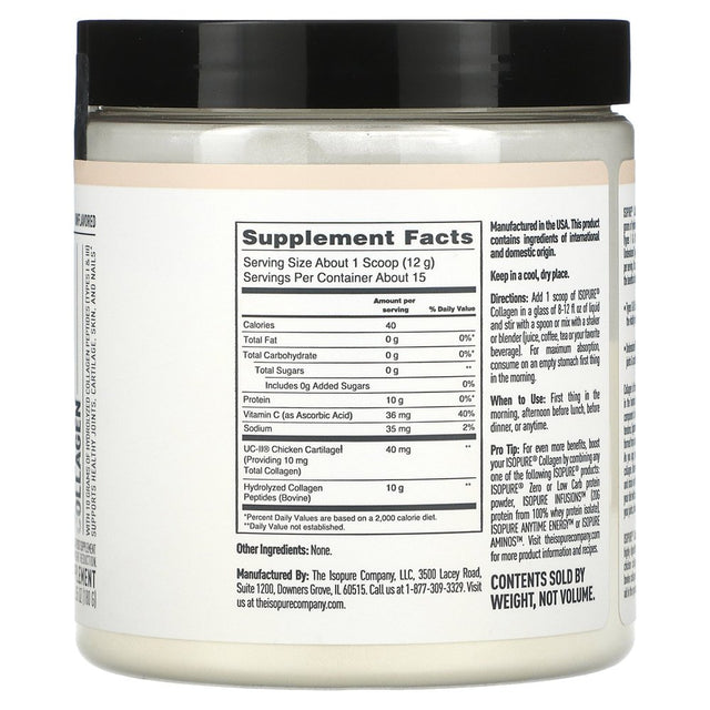 Isopure, Collagen, 10 G Collagen Protein, Unflavored, 6.35 Oz, 15 Servings