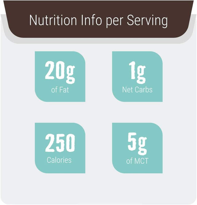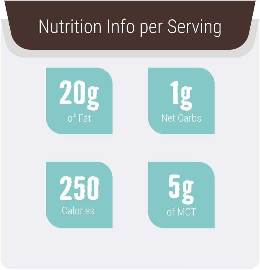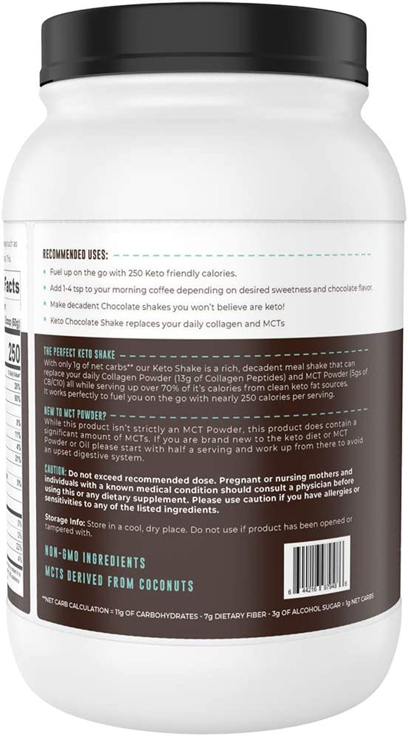 • Keto Chocolate Meal Replacement Shake - 20g of fat, 5g of MCTs (C8 / C10) 250 calories, 14g of protein from grass fed collagen, 0g of sugar. Not a low calorie food.