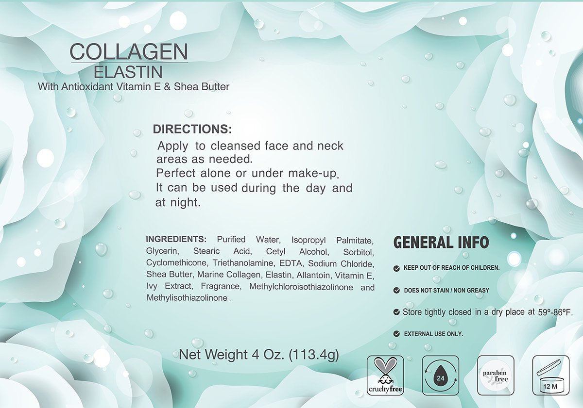 Collagen Elastin Cream / 4 oz Collagen Elastin cream contains active ingredients which provide great benefits for the appearance of the skin. The collagen protein decreases with age. Because of this, the skin loses its firmness and elasticity, highlights the facial expression lines and signs of aging become more visible. This cream penetrates through the pores and gives skin the balance of moisture necessary to maintain freshness. The concentration in the formula maximizes collagen levels for a younger looking skin.