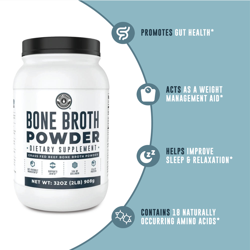 - This grass fed beef bone broth powder contains no extra carbs or sugars with simple, gut friendly Ingredients. Unlike other protein powders, our formulation focuses on simple ingredients that support proper gut health. That means we've avoided ingredients that can potentially cause stomach upset, like guar gums or xantham gums, which other companies use as a thickening agent.