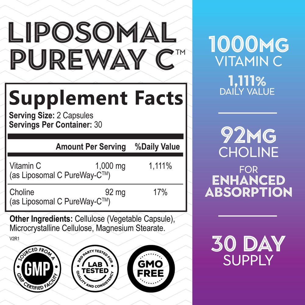 Liposomal Vitamin C Extra Strength 1000 mg PureWay Vitamin C Supplement for Immune Support & Collagen Booster, Buffered Soluble Nature's Liposome Vit C, Encapsulated for High Absorption
