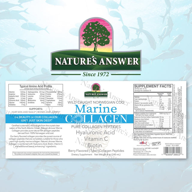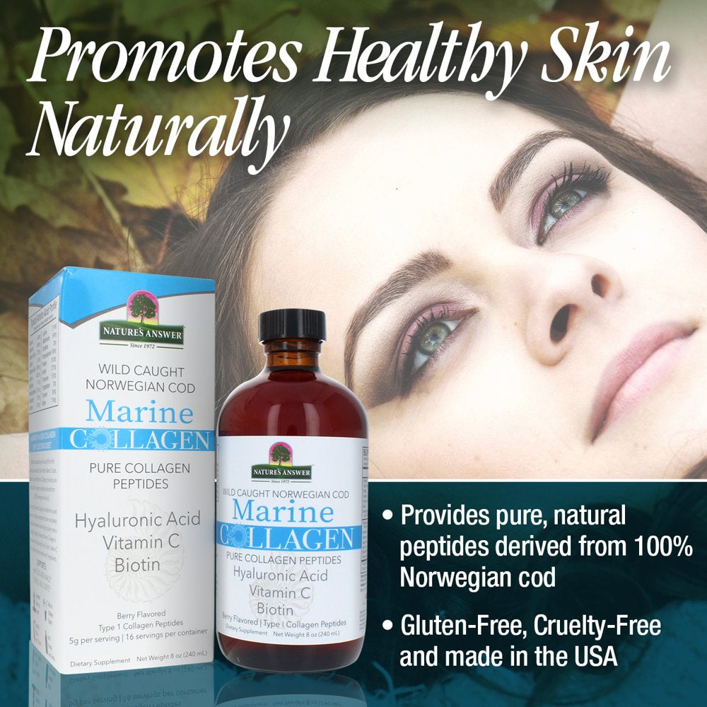 Marine Collagen Liquid 8oz Marine Collagen has long been treasured by the Chinese for what they believe is its natural youth enhancing ability. Collagen is found in the skin, cartilage, tendons, bones, and ligaments. The word collagen , comes from the word kola, the Greek word for glue. Collagen is in fact the glue that holds the body together. As we get older, our bodies produce less collagen leading to wrinkles and weakened joints. Nature’s Answer brings you the purest source of collagen peptides available today. Nature’s Answer Wild Caught Marine Collagen . Wild caught from the crystal-clear waters of the North Atlantic Ocean. It provides pure, natural fish collagen peptides derived from 100% Norwegian wild cod. The purest source of collagen peptides. This premium quality Norwegian wild cod, plus the addition of Hyaluronic Acid, Biotin, Vitamin C and a proprietary blend of natural beauty enhancers from fruit and plant extracts is what sets Nature’s Answer Wild Caught Marine Collagen apart from any other Marine collagen. In your choice of a delicious berry-flavored liquid or unflavored powder, Nature’s Answer Wild Caught Marine Collagen provides the purest source of collagen peptides. The delicious berry flavored liquid can be taken directly or infused in your favorite beverage. The powder versions mix easily into your go-to hot or cold beverage and are available in two convenient sizes. When you choose  Nature’s Answer Wild Caught Marine Collagen , you get the experience and care of a family-owned company with a nearly 50-year reputation for quality and goodness. *These statements have not been evaluated by the Food and Drug Administration. This product is not intended to diagnose, treat, cure, or prevent any disease .