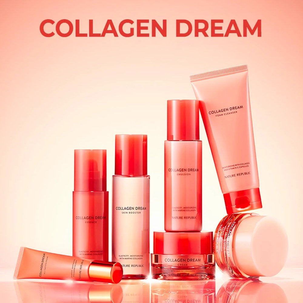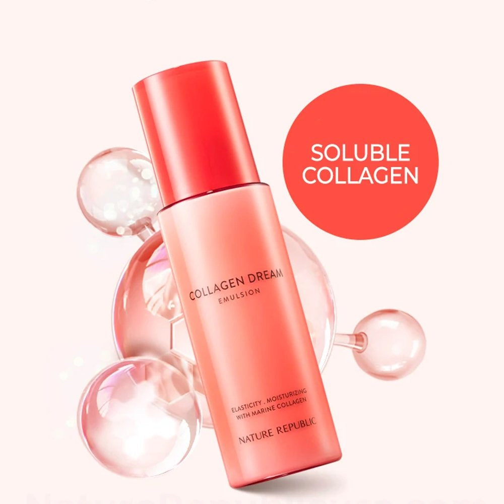 Nature Republic Collagen Dream 70 Deep Moisturizing Emulsion 130ml. Brand stories: Nature republic believes in the greatness of nature. Our objective is to convey the gifts that originated from nature to our customers in their natural state. Nature republic always suggests the products balanced between good quality and price. Because we want to people worldwide to enjoy gifts from nature through our brand and our products. Studying nature in the world and serving customers worldwide give us new inspiration. As a pioneer who seeks cosmetics in nature, we don't imitate anyone but research products that resembled Mother nature. We enjoy communicating with our customers all the time and share the pleasure and benefits with them. Nature Republic Moisturizing Collagen Dream 70 Emulsion contains 70% water-soluble Collagen, which gives your skin vitality and reinforce your skin's barrier. The Emulsion has a silky emulsion formula, which gives moisture and nourishment.