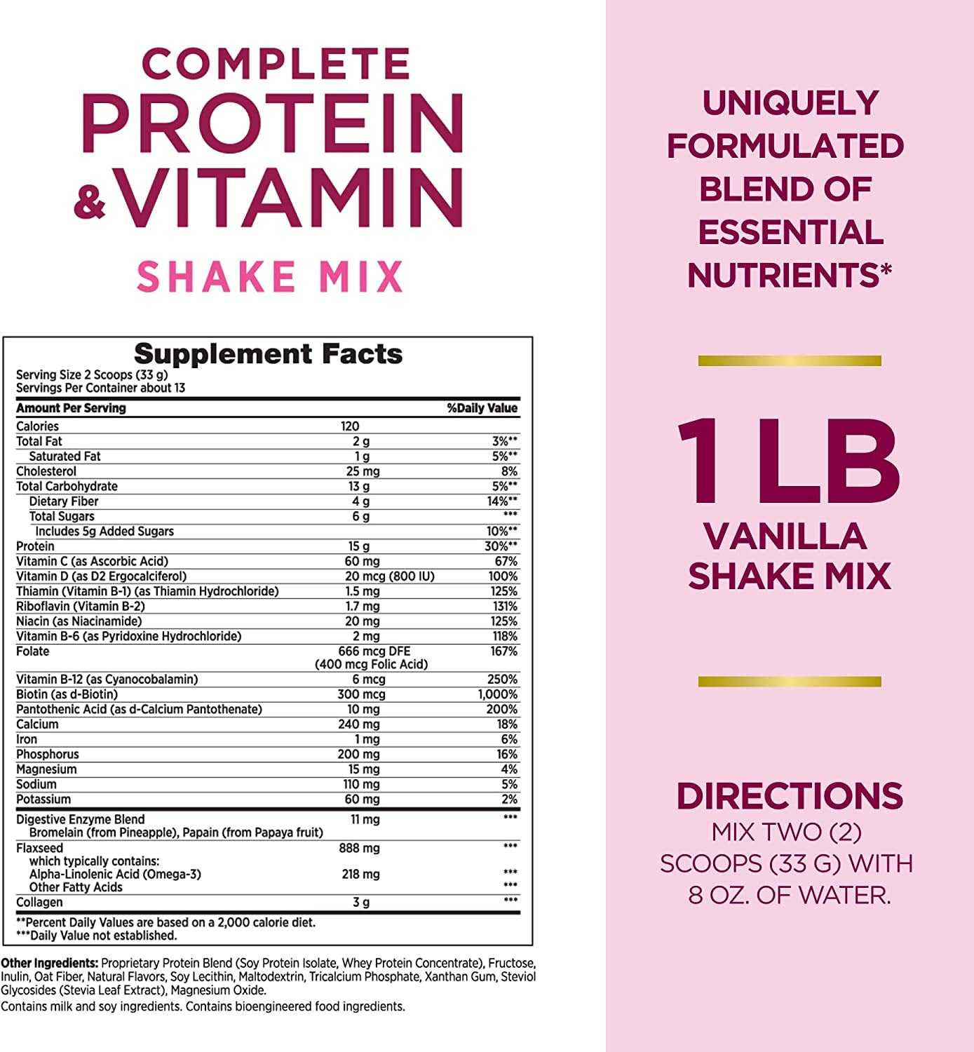 Nature'S Bounty Complete Protein & Vitamin Shake Mix with Collagen & Fiber, Contains Vitamin C for Immune Health, Vanilla Flavored,1 Pound (Pack of 1)