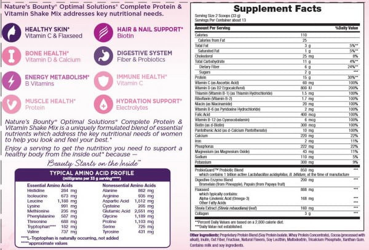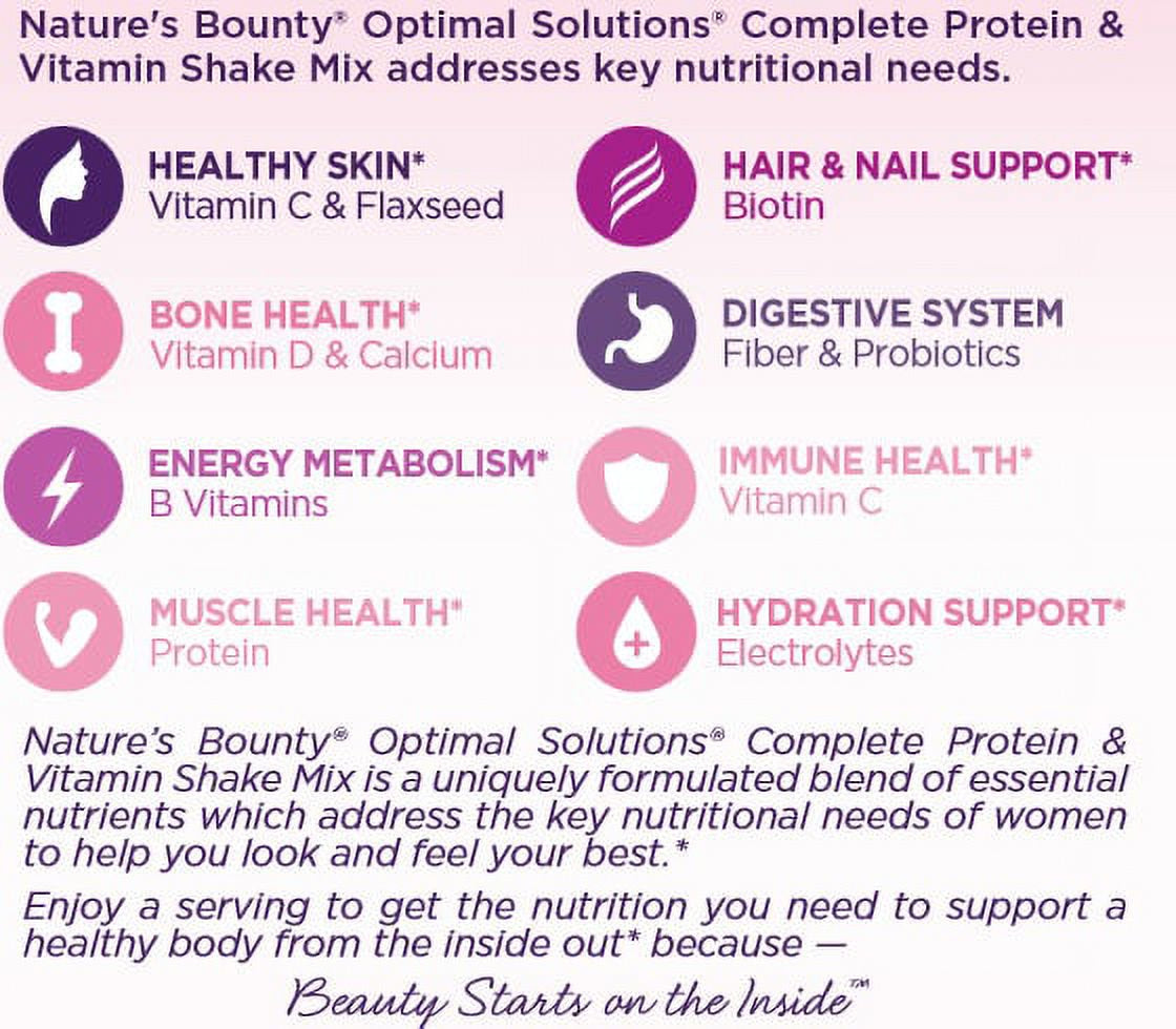 Nature’s Bounty Complete Protein and Vitamin Shake Mix is an exciting way to get the nutrients you need most.* Our Chocolate and Vanilla flavors are decadent Optimal Solutions for health. Each serving provides important Protein, Fiber, B vitamins, antioxidants, electrolytes, probiotics and more!