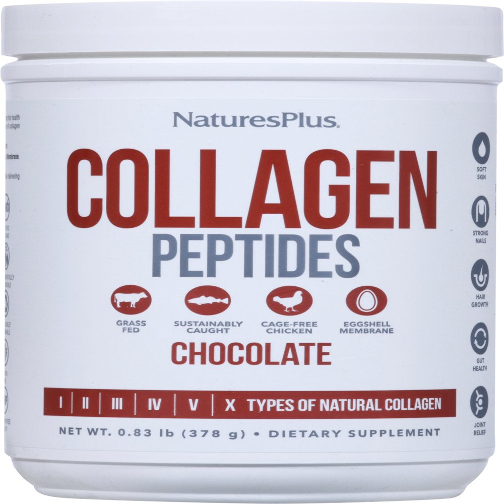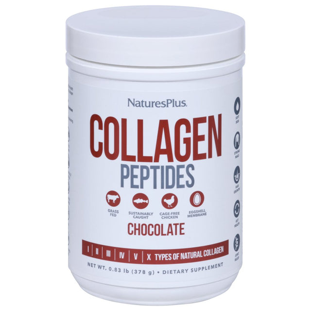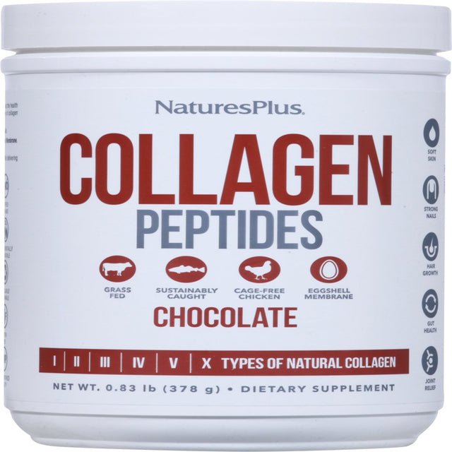 - Dietary Supplement. Gluten free. Free from synthetic colors, preservatives. Certified Non GMO. Typical Amino Acid Profile Per 27 g Serving: Glycine 4447 mg; Hydroxyproline 2521 mg; Glutamic Acid 2074 mg; Arginine 1784 mg; Alanine 1691 mg; Aspartic Acid 1196 mg; Lysine 704 mg; Serine 685 mg; Leucine 542 mg; Valine 437 mg; Threonine 399 mg; Phenylalanine 308 mg; Isoleucine 294 mg; Histidine 166 mg; Methionine 143 mg; Tyrosine 103 mg; Cysteine 20 mg. Grass Fed. Sustainably Caught. Cage-free chicken. Eggshell Membrane. I II III IV V X Types of Natural Collagen. Soft skin. Strong nails. Hair growth. Gut health. Joint relief. NaturePlus's superior collagen forms mix quickly and easily. No blender required! Not to be used as the sole source of dietary calories or protein. Settled fill. Initial fill. Manufactured with love by Natural Organics, Inc makes of Natures Plus. Notice: This product is sold by weight, not volume. Settling of contents may occur during shipping and handling. Look and feel your best with NaturesPlus chocolate Collagen Peptides. Boost the health of your hair, skin, nails, joints, immune system and much more with the power of collagen protein peptides in a delicious chocolate flavor you'll love! NaturesPlus chocolate Collagen Peptides provides the highest quality Collagen available: Sourced from Grass-Fed Beef, Wild-Caught Cod, Cage-Free Chicken and Eggshell Membrane. Clean, sustainable ingredients are the best choice of collagen sources. These 6 major Collagen Types (I, II, III, IV, V & X) provide a powerful profile delivering exceptional whole body benefits. Maximized Absorption: Superior source hydrolyzed collagen with collagen digesting enzymes to maximize absorption. Full spectrum collagen provides whole body results: Type 1 - skin elasticity. Type II - Joints and immune system. Type III - skin, blood vessels, vital organs. Type IV - cell health and growth. Type V - skin, tendons and immune system. Type X - joints, bones, muscles and hair. Natures plus vanilla collagen peptides. Clean. Pure. Optimized. Don't settle for non-Hydrolyzed collagen. GMP Certified Facility. naturesplus.com. www.canyonplastics.com. Environmentally Responsible. Recyclable/ Renewable. (These statements have not been evaluated by the Food and Drug Administration. This product is not intended to diagnose, treat, cure or prevent any disease.)