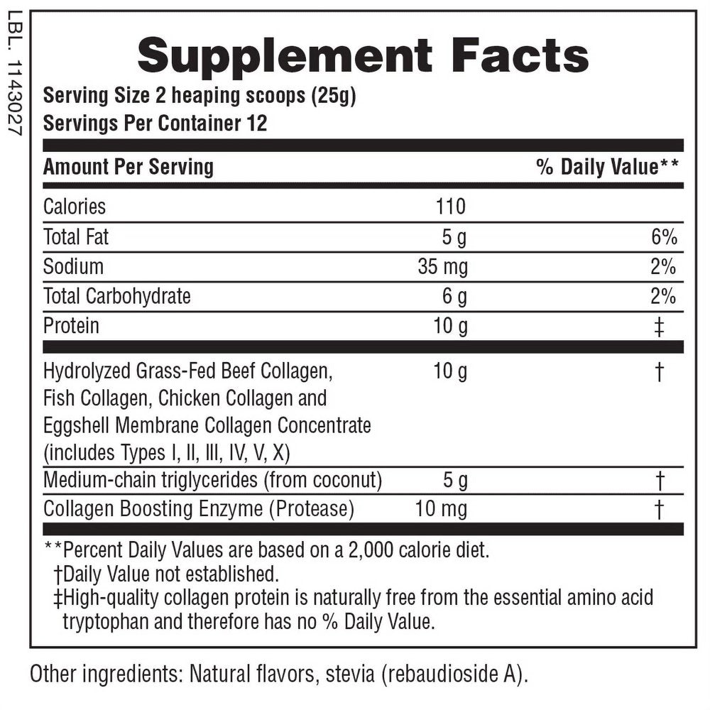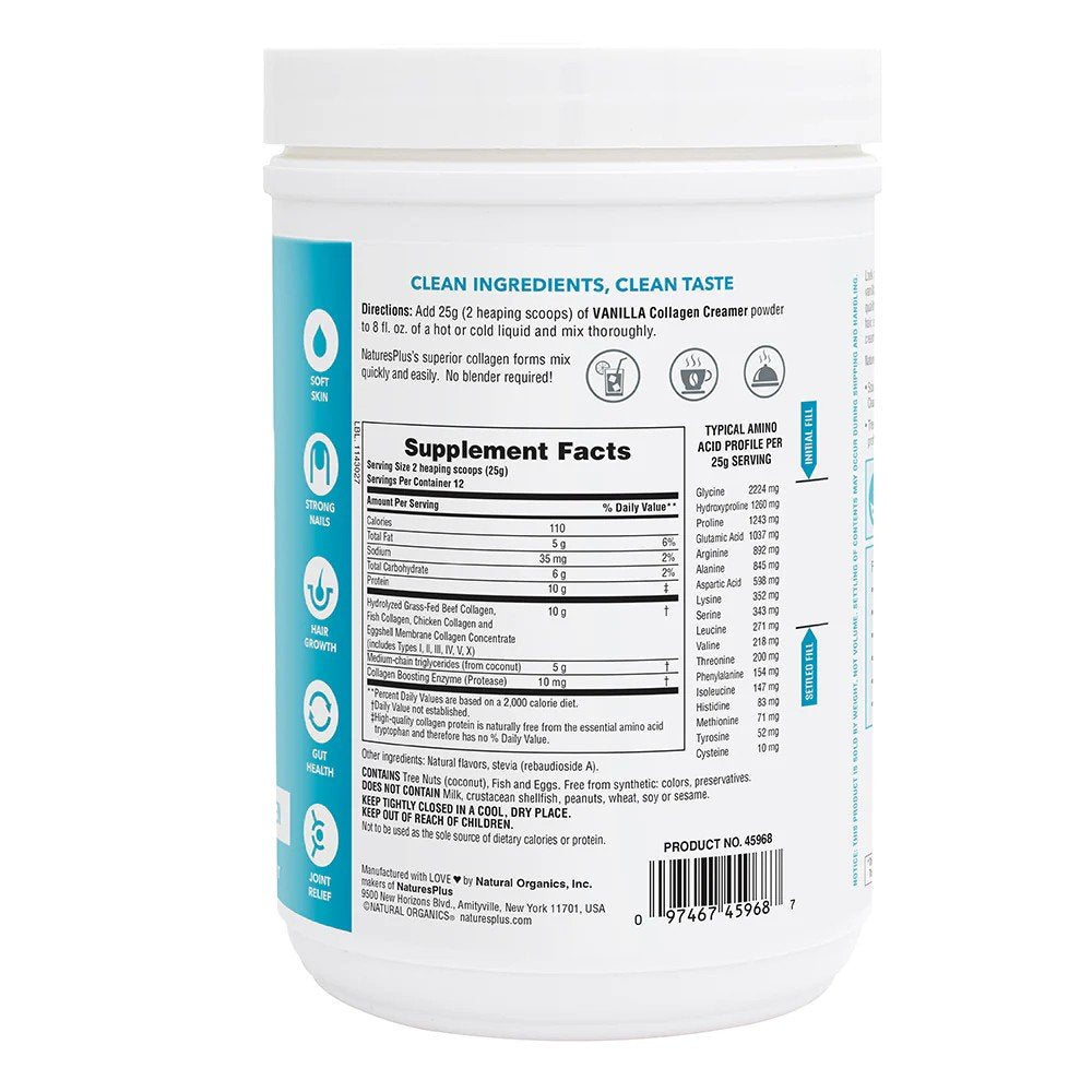 Collagen is a structural proteinit is what your body is literally made ofso you need it in your diet. NaturesPlus Vanilla Collagen Creamer supplies all of collagens benefits in optimal hydrolyzed formwhile giving your coffee a delicious vanilla flavor youll love!