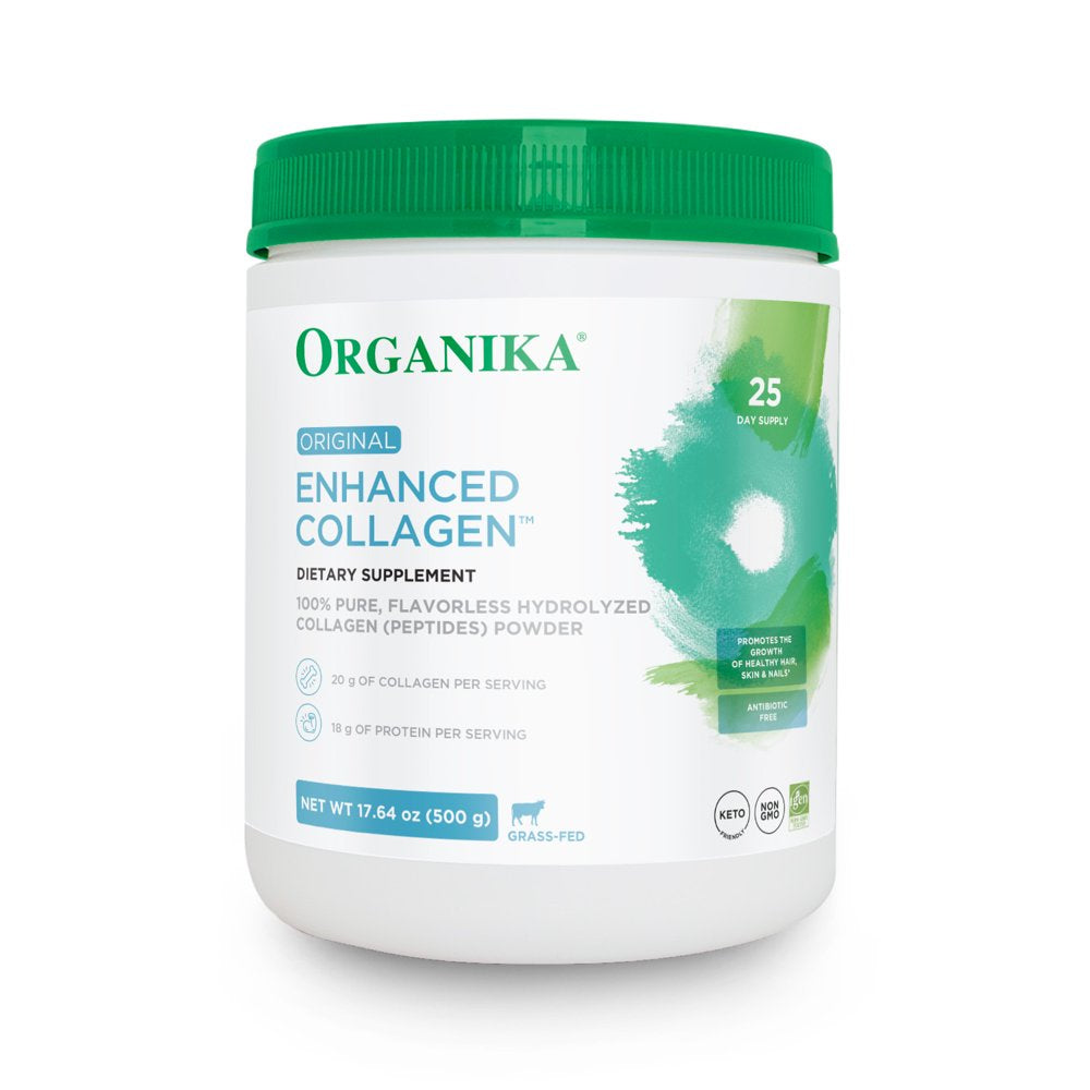Organika Enhanced Collagen Peptides Powder restores collagen for healthy looking skin, nails and hair. This flavourless and odourless formula is hydrolyzed for maximum absorption in the body. It is naturally sourced from grass-fed cows free of all hormones, antibiotics, and GMO's. Collagen is an excellent support for healthy joints, cartilages and very beneficial for digestive health and immunity. A 25-day serving at 17.64 ounces / 500 grams.