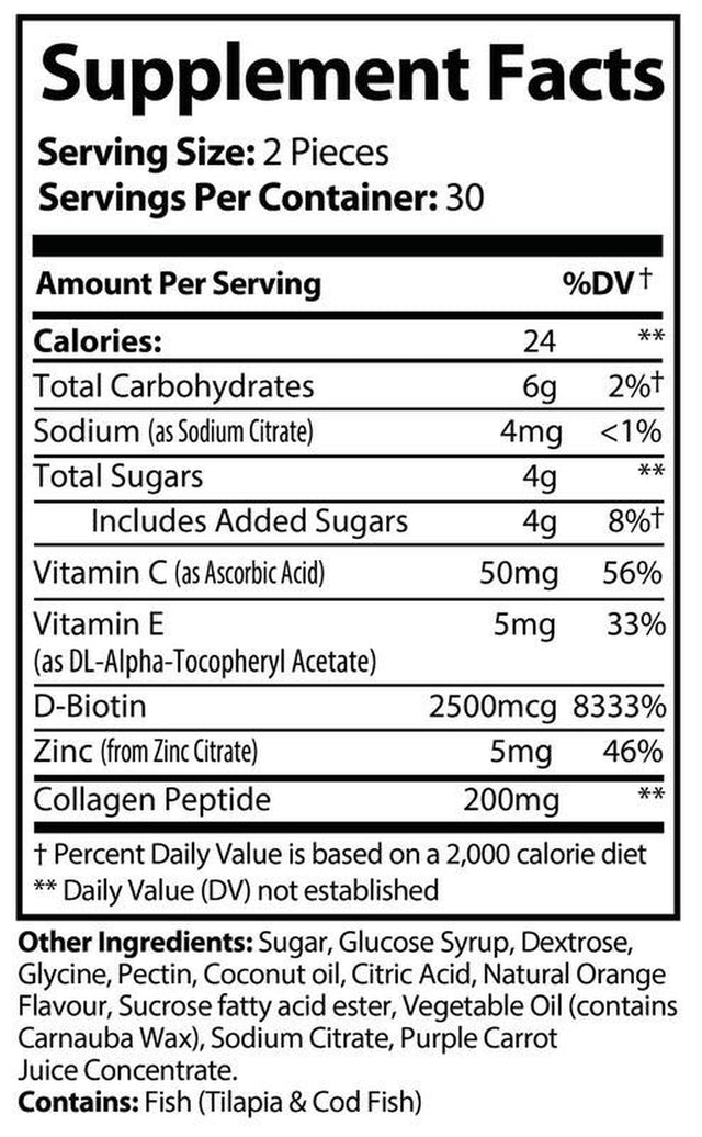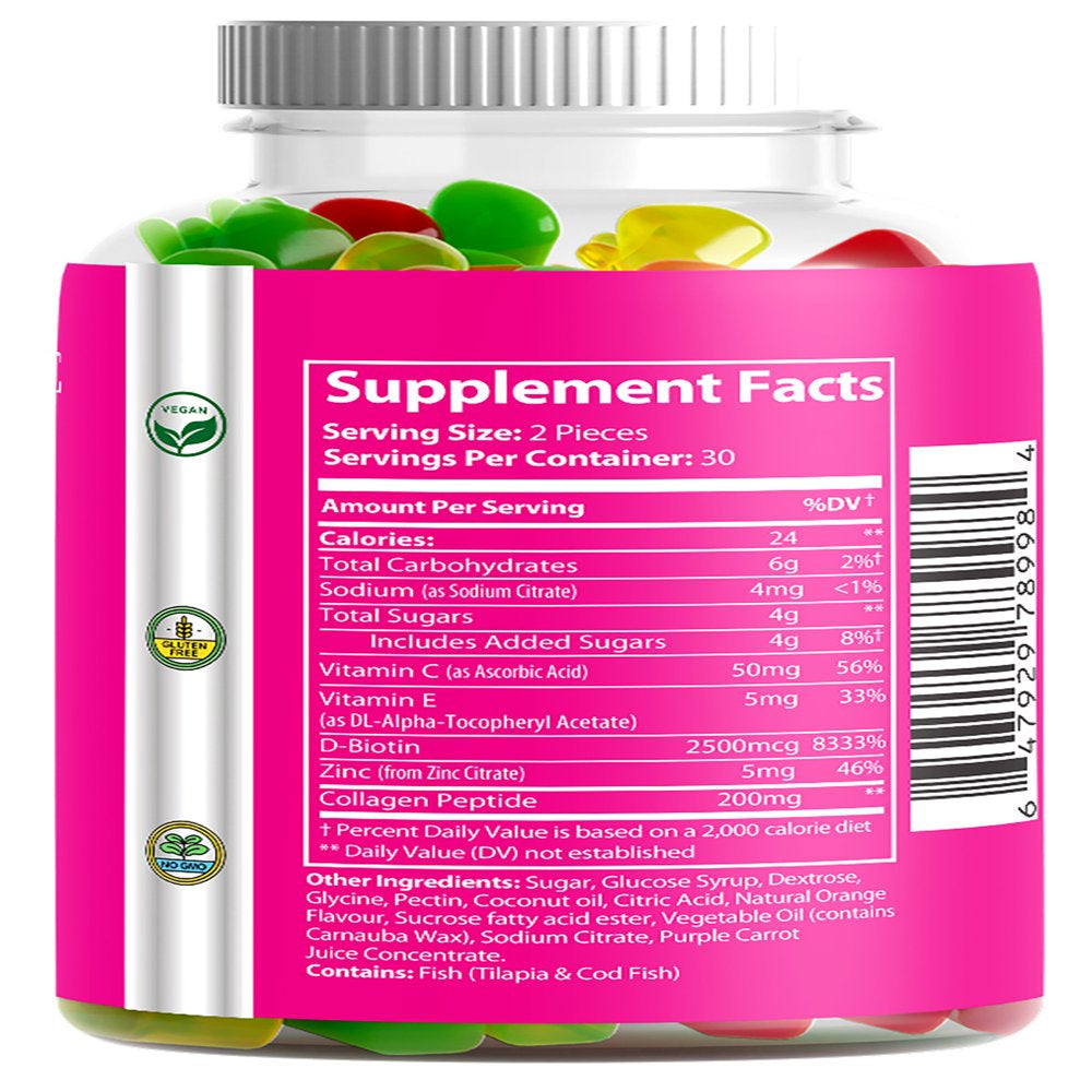 Collagen Gummies Formulated to Increase Hair, Skin, and Nail Growth with Natural, Vital Proteins and Collagen Vitamins; NON-GMO, Gelatin-Free, & Pure Convenient and delicious way to nourish your body.* Hydrolyzed collagen works together with other key nutrients (Vitamin C, E, and Biotin) to sustain healthy collagen levels and support the skin matrix to maintain firmness and tone.* Collagen also provides essential amino acids for elastin and keratin?the building blocks of healthy hair and nails.* Collagen is the primary building block of the connective tissue in our skin and joints. As we age naturally, our body?s ability to repair and renew joint tissue is challenged. Over time, our cartilage erodes and collagen fragments are released into the joint making inflammatory reactions occur at higher rates. Supplementing daily with our collagen gummies is an excellent way to help support healthy skin and joints and combat typical aging.* Our product was carefully crafted to be gelatin-free, non-GMO formula, 100% hydrolyzed type 1 & 3 collagen.* Bursting with natural fruit flavors and packed with hydrolyzed collagen, this will become an integral part of your daily health and beauty routine.*