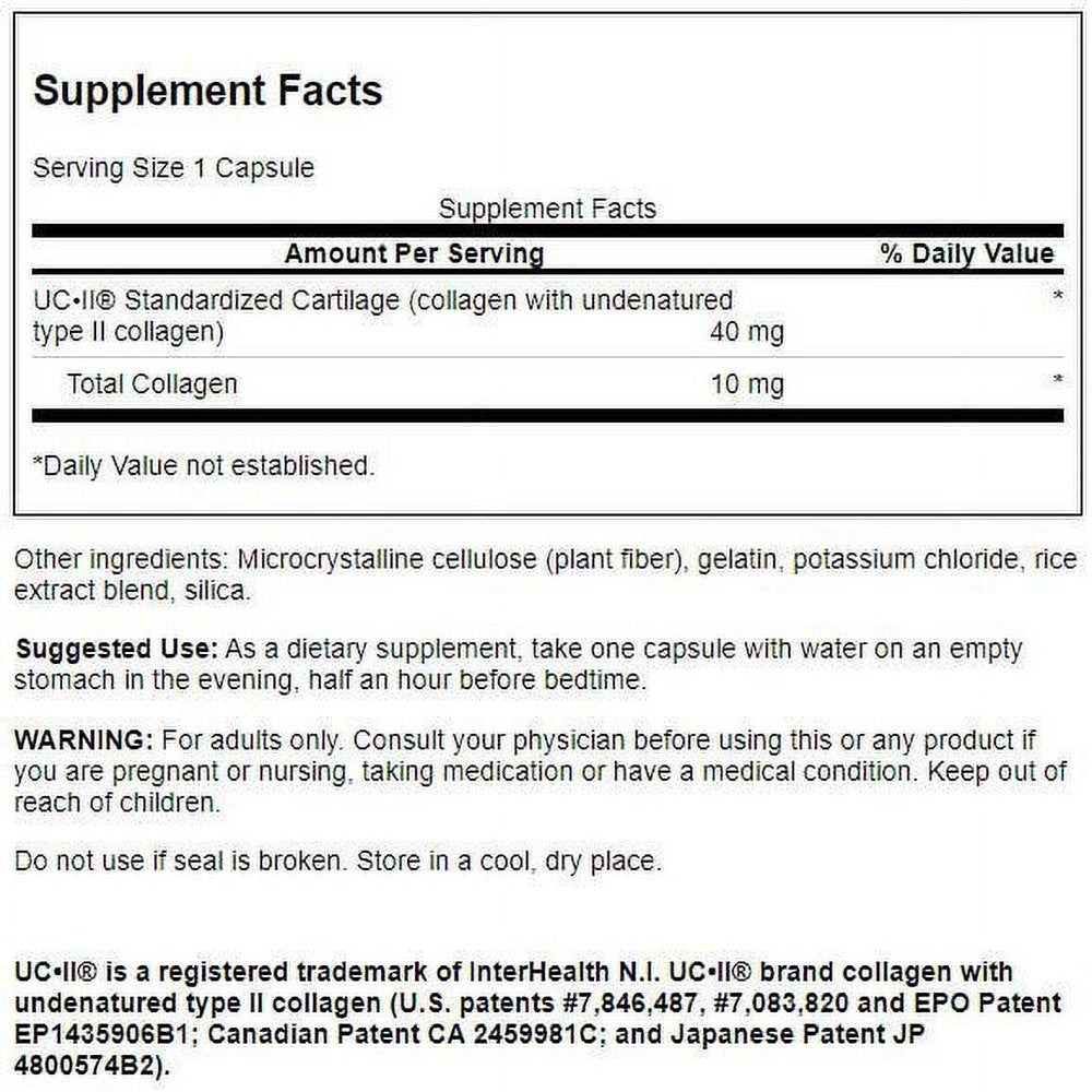 Keep your joints working comfortably with the patented nutrition of UC-II(R) Standardized Collagen. Awarded four U.S. patents for use in promoting joint health, UC-II is the only type II collagen supplement that's undenatured, retaining its original molecular structure. 40 mg UC II standardized cartilage (collagen with undenatured type II collagen) per serving.