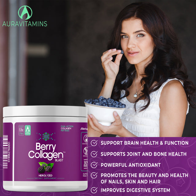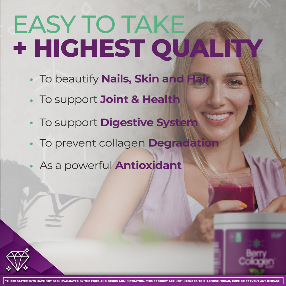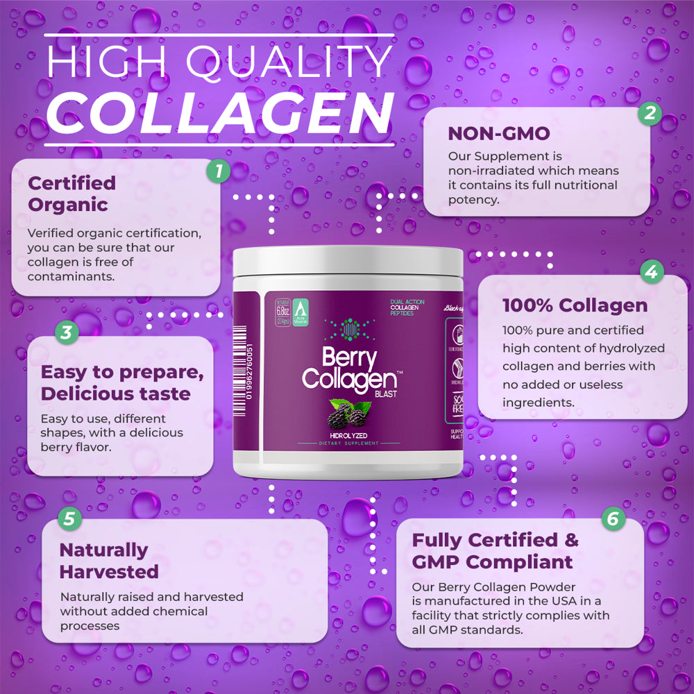 * ENHANCED ALL-IN-ONE BONE BROTH COLLAGEN PEPTIDES POWDER: Your Collagen needs are covered with this all-in-one, ultra-premium bone broth, super absorbent medical grade collagen powder supplement with a high-quality, potent. * 100% HYDROLYZED COLLAGEN – Collagen makes up 30 percent of all proteins in the body and functions to hold the body together. It works to support woman and man hair, skin, nails, joint, muscle, and your gut! Plus easy and convenient to eat and mix compared to multiple other naturals liquid hydrolyzed collagen whey powdered drink, food capsules, bulk sourced large drinkable protein supplement. * MANUFACTURED IN A GMP CERTIFIED FACILITY – Berry Collagen Blast is one of the largest manufacturers of naturally sourced supplements in the USA. Our GMP certified facilities only use all-natural ingredients. * NO ADDITIVES | There is NO sugar, calories, maltodextrin, GMO's, gluten, or artificial ingredients! * DOUBLE HYDROLYZED COLLAGEN PLUS DIGESTIVE ENZYMES FOR ENHANCED ABSORPTION: Our hydrolyzed collagen peptides powder MIXES WITH ANYTHING, is DOCTOR-APPROVED, HORMONE-FREE, GRASS-FED and PASTURE-RAISED. It's also all-natural, non-GMO.