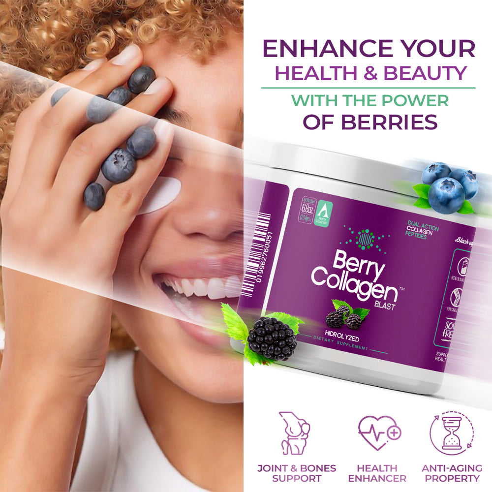 Berry Collagen Blast Powder Hydrolyzed (2) |Premium Blend Grass-Fed - Soy Free | Dual Action Collagen Peptides | Support Bones and Joints | Blueberry & Blackberry | IGEN GMO - 204 Grams