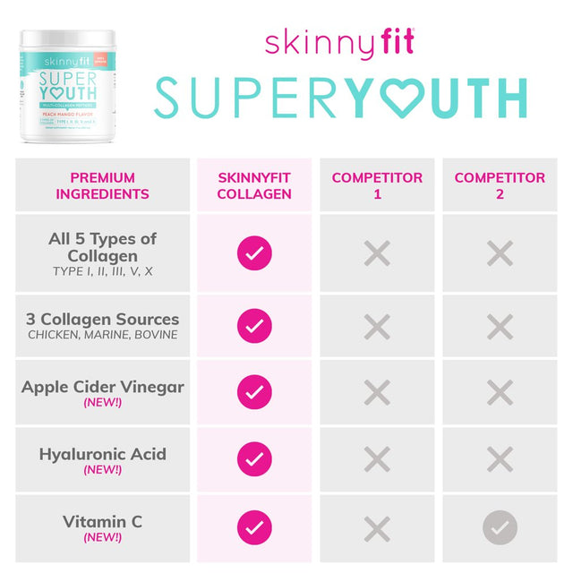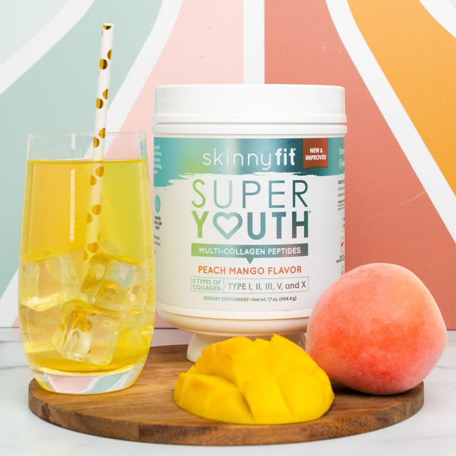 SkinnyFit Peach Mango Super Youth - Look and feel younger with Super Youth Peach Mango! This fruity collagen powder includes 5 collagen types from 4 natural sources plus apple cider vinegar, hyaluronic acid, and vitamin C to restore youthfulness from the inside out. Simply add 2 scoops of Super Youth into 16 oz. of water or more, depending on your desired level of sweetness, or to a smoothie, mix and enjoy peach mango goodness! Tastes amazing with just water! Super Youth promotes youthful-looking skin, longer hair & nails, reduced joint pain, gut health, and weight loss. From your skin to your joints, you’ll notice the difference as you make Super Youth collagen dietary supplement a daily routine.