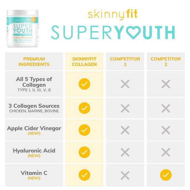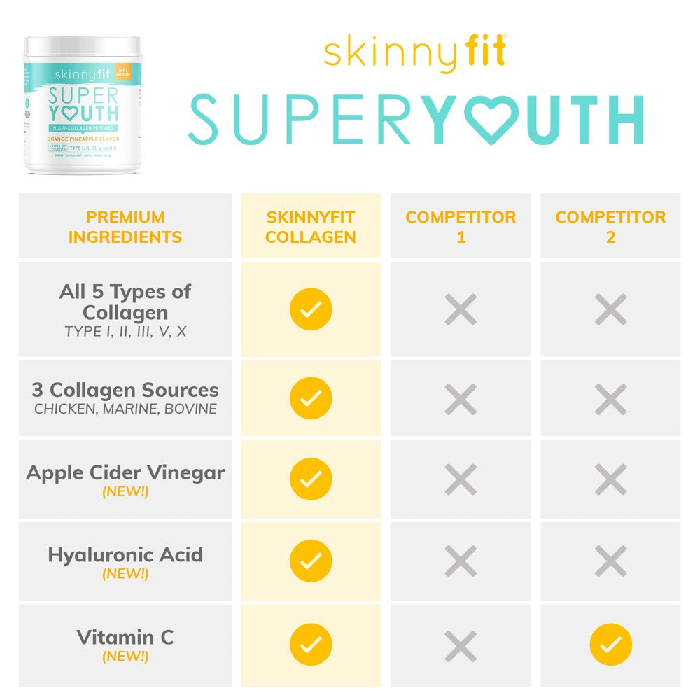 - OUR PREMIUM COLLAGEN BLEND TASTES BETTER THAN EVER. Super Youth Orange Pineapple contains 5 of the healthiest types of hydrolyzed collagen peptides plus apple cider vinegar, hyaluronic acid, and vitamin C. It’s gluten-free, non-gmo, and has a refreshing fruity flavor you’ll love. Super Youth Orange Pineapple is so delicious and dissolves so easily, it can be mixed with water alone!