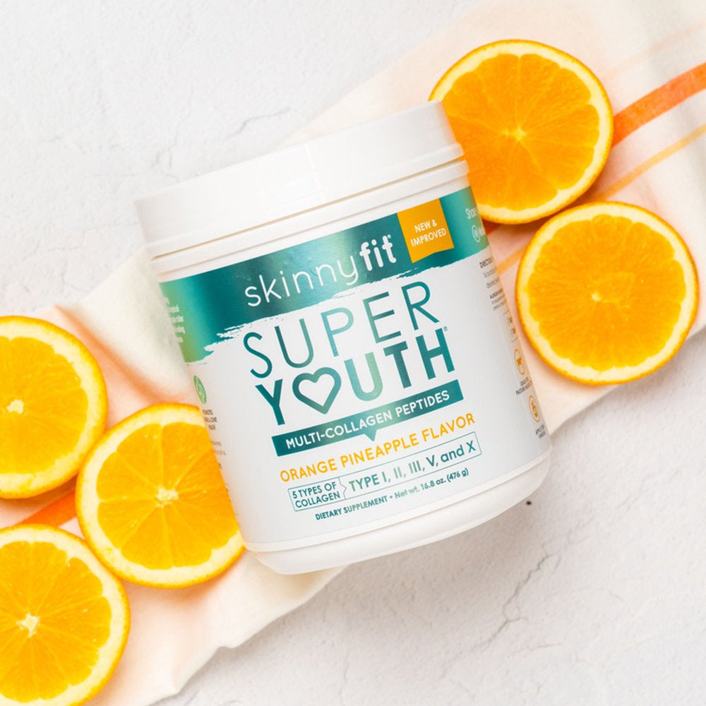 SkinnyFit Orange Pineapple Super Youth - Look and feel younger with Super Youth Multi-Collagen Peptides! This delicious collagen powder includes 5 collagen types from 4 natural sources plus apple cider vinegar, hyaluronic acid, and vitamin C to help restore youthfulness from the inside out. Simply add 2 scoops of Super Youth into 16 oz. of water or more, depending on your desired level of sweetness, or to a smoothie, mix and enjoy orange pineapple goodness! Super Youth promotes youthful skin, longer hair & nails, reduced joint pain, gut health, and helps you lose stubborn weight. From your skin to your joints, you'll notice the difference as you make Super Youth a daily routine. Contains about 28 servings.