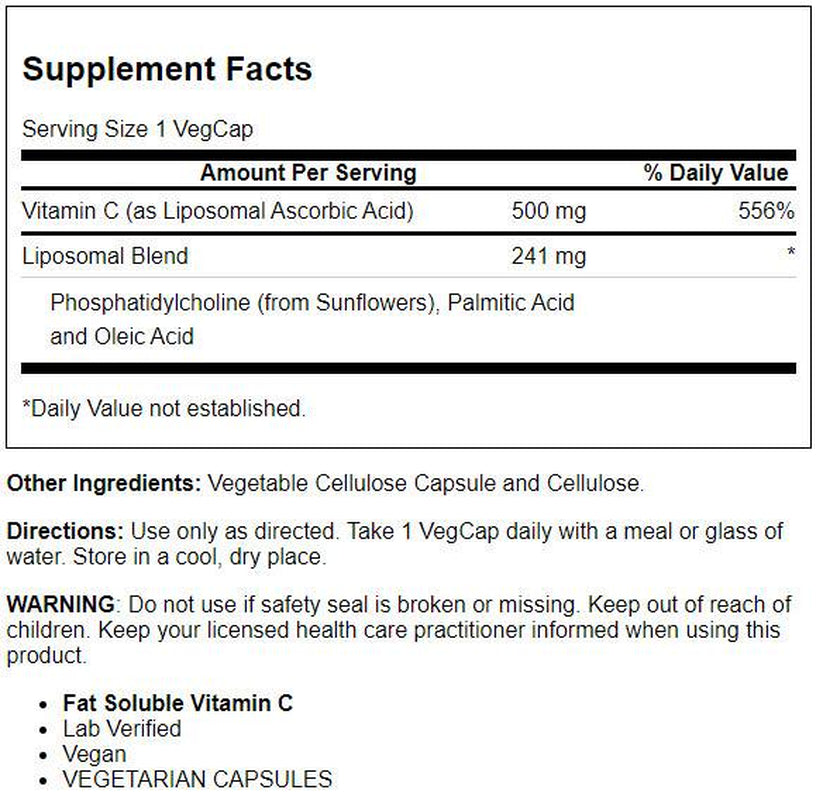 Solaray Liposomal Vitamin C 500Mg, Healthy Immune Function, Collagen Synthesis & Antioxidant Support, Vegan, 100 Vegcaps is backordered and will ship as soon as it is back in stock.