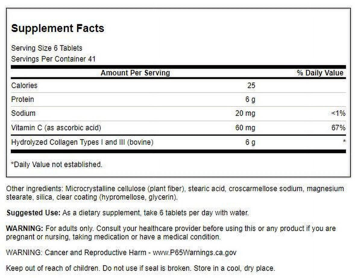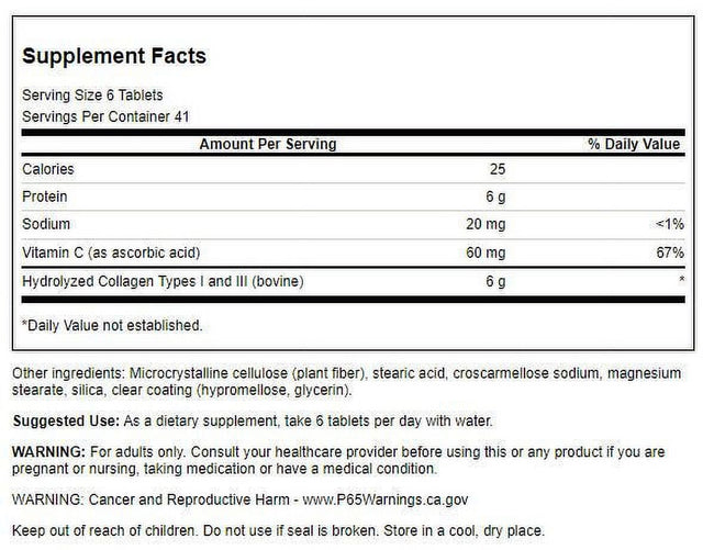 Collagen is the most abundant protein in the body and necessary for connective tissue health--think skin, tendons and ligaments. Supplemental collagen supports these important structures while vitamin C boosts the body's natural production of collagen. Swanson Hydrolyzed Collagen Peptides + Vitamin C delivers 1,000 mg of collagen from types I and III along with 10 mg vitamin C to promote youthful looking skin and healthy joints. Type I Collagen is usually taken to target skin elasticity and skin hydration , as well as to strengthen nails and thicken hair. Type III Collagen is usually found in combined supplements, most often along with type I collagen, as is the case in the body where it helps to promote total body health and provide building materials for growth and maintenance of healthy tissues. Vitamin C is needed by the body for the maintenance and synthesis of collagen. It also offers antioxidant protection against external factors that can impact skin health and