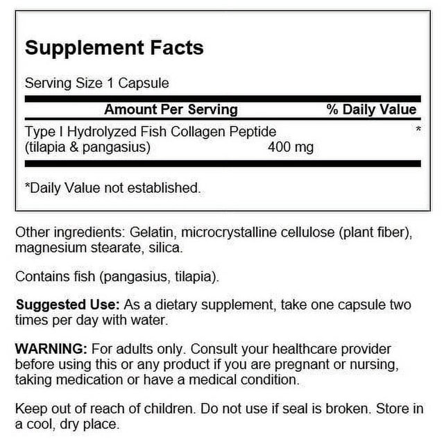 Type I Hydrolyzed Fish Collagen 400 mg *,Other ingredients: Gelatin, microcrystalline cellulose (plant fiber), magnesium stearate, silica.,Contains fish (pangasius, tilapia).,As a dietary supplement, take one capsule two times per day with water./div>