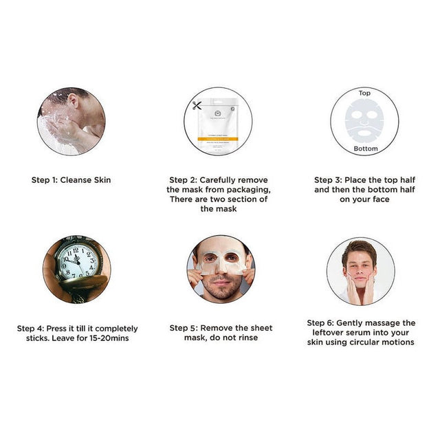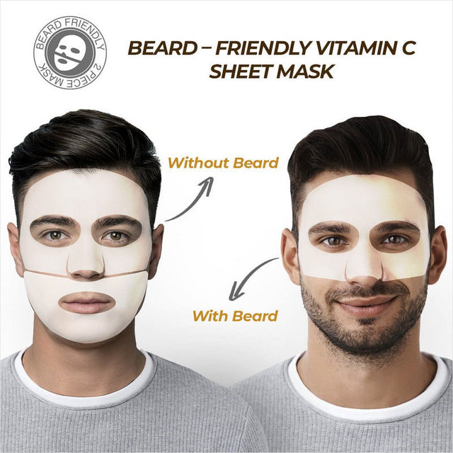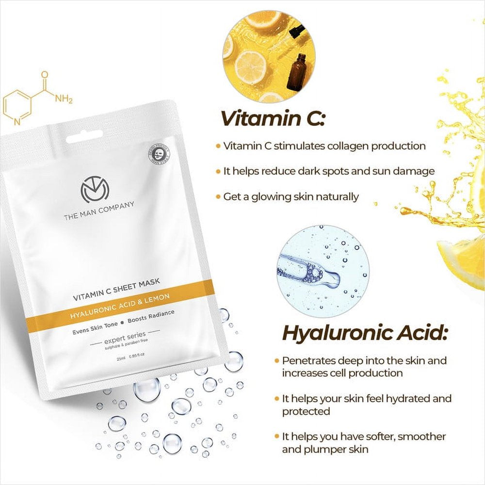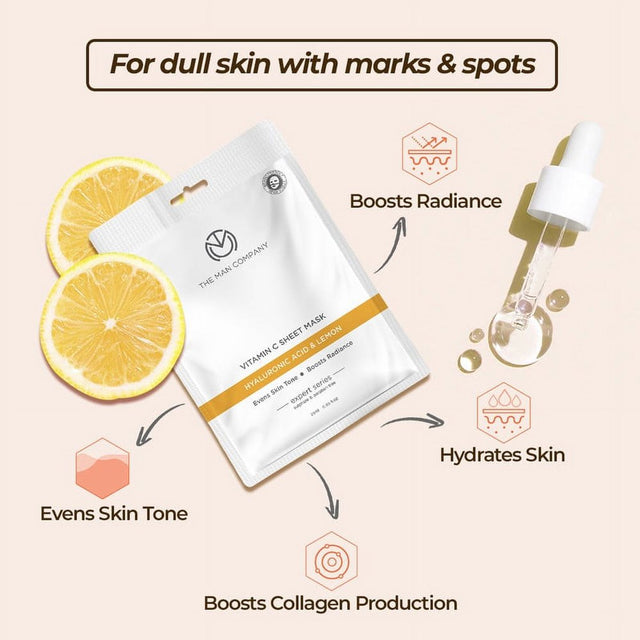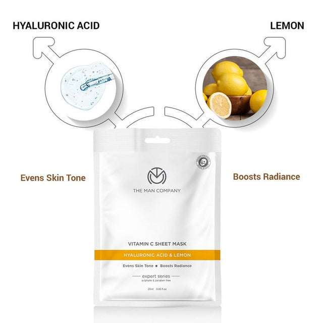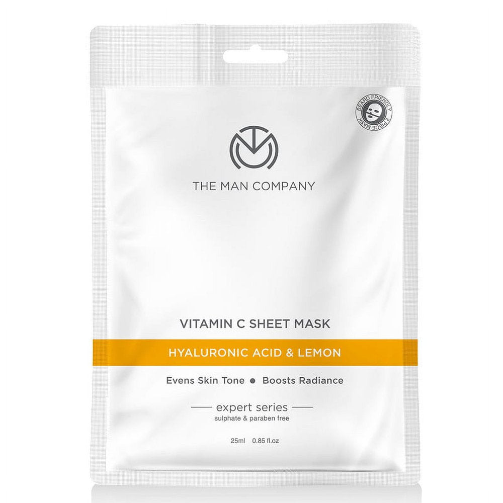 - Vitamin C Sheet Mask: The Man Company comes with a two-piece sheet mask for glowing skin enriched with Vitamin C, Hyaluronic Acid, Lemon, and Moringa Oil. The Vitamin C Sheet Mask is a two-piece beard-friendly sheet mask, enriched with the power of Vitamin C as an active ingredient.