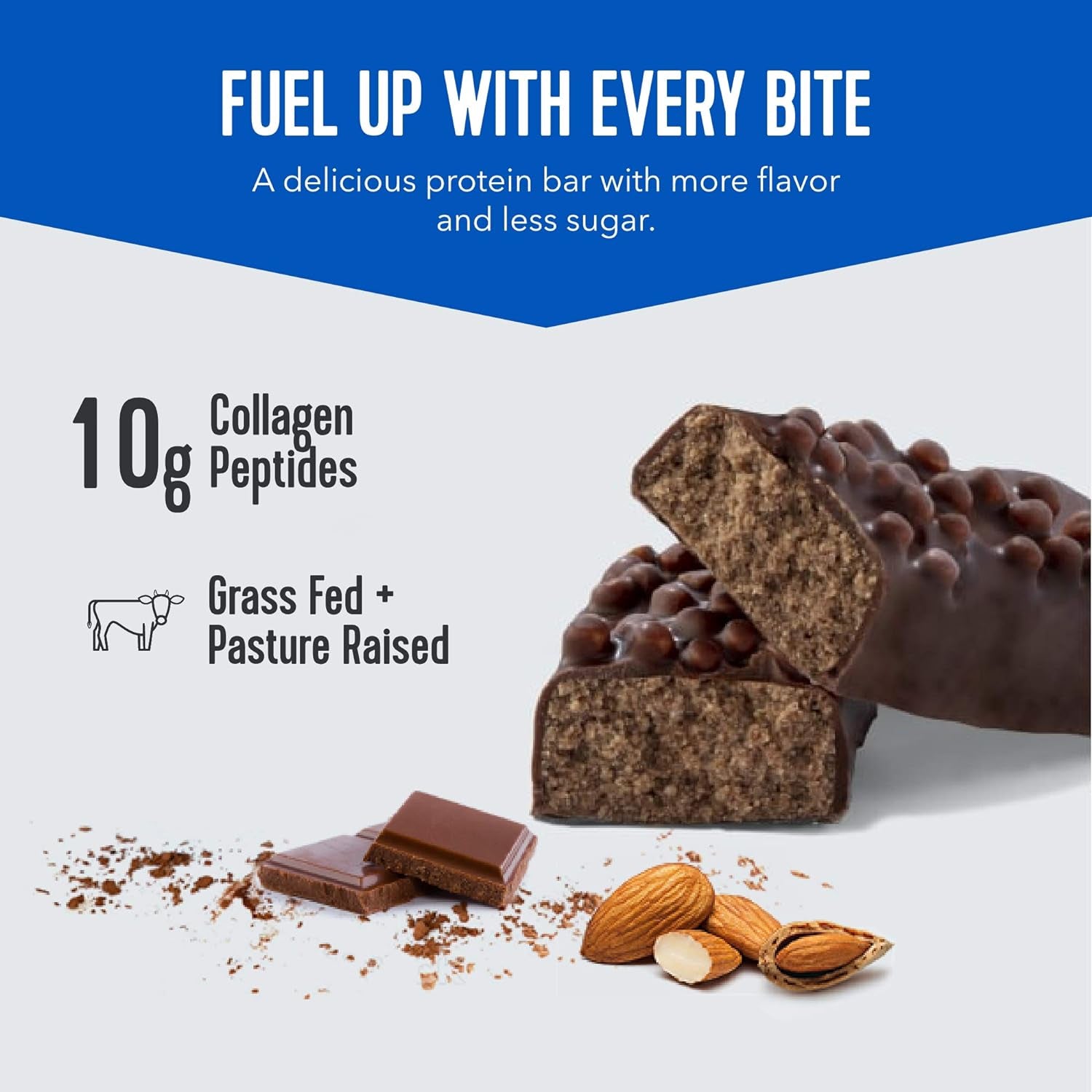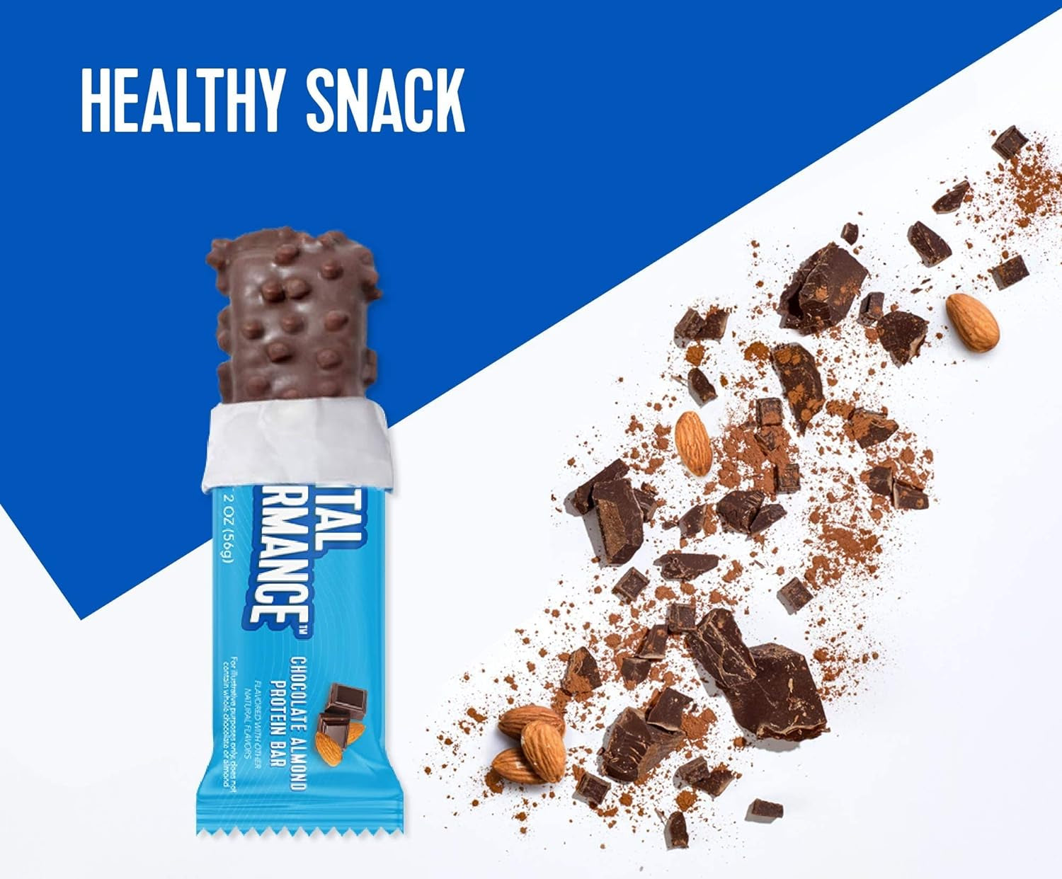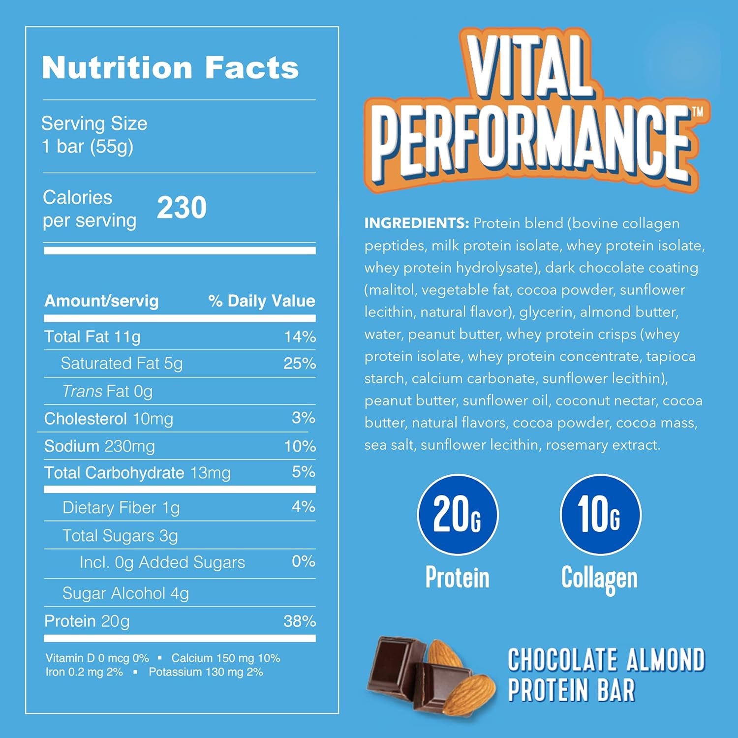 Vital Performance Protein Bar, Healthy Snacks, 20G of Protein, 10G of Collagen Peptides, 2-3G of Sugar, Low Lactose, 12 Pack, Chocolate Almond