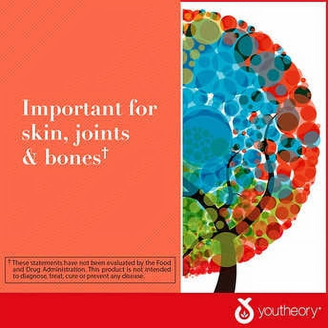 Product Overview Youtheory® Collagen Advanced Formula provides bioactive collagen peptides to help replenish your body’s supply of vital collagen.† Youtheory® Collagen Advanced Formula delivers 6 grams (6,000 mg) of hydrolyzed collagen per serving, plus a daily supply of Vitamin C, to help combat age-related collagen loss. Collagen is the most abundant protein in the human body1 and a key constituent of skin, joints, bones, blood vessels, organs and more. The word “collagen" is derived from kolla, the Greek word for glue. Collagen is literally the substance that binds us together. It forms an extensive netlike framework throughout the inner body and imparts shape and structural strength to virtually every tissue. While bountiful in youth, the collagen content of the body gradually decreases with age, leading to thinner, weaker, less resilient tissues over time.2 Loss of collagen is one of the most profound consequences of the aging process. One of the fastest and easiest ways to replenish this vital protein is to supplement your diet with hydrolyzed collagen. Hydrolyzed collagen is a special type of protein that is “pre-digested” or broken down into smaller peptides for enhanced absorption into the body. Several studies have demonstrated that hydrolyzed collagen peptides are quickly absorbed after ingestion3 and readily deposited in the body’s tissues, where they act as building blocks and may help to trigger your body’s own internal collagen production.4 Vitamin C is well-known for its antioxidant properties. But it’s also critical for internal collagen synthesis.5 Vitamin C is used by the body to convert proline into hydroxy-proline 9 – an amino acid that plays a key role in collagen stability; in short, hydroxyproline puts a twist in collagen's triple helix structure. Without this singular amino acid, collagen-containing tissues will inevitably fall apart and the body will cease to manufacture new collagen proteins. Suggested Adult Use: Take six (6) tablets per day, all at once or in divided doses (total: 6 grams collagen per day). Other Ingredients: Magnesium stearate (vegetable source). This product is manufactured in a facilty that processes whey milk protein and fish extracts. May contain sulfite residues. Usage Warnings: Check with your doctor before using this product if you are taking medication or have any medical conditions, including liver or kidney disease, or if you have been instructed to follow a low protein diet. Do not use if you are pregnant or nursing. Do not exceed the recommended daily intake. Hydrolyzed collagen has been used safely for decades and is GRAS-affirmed (Generally Recognized As Safe). May cause mild gastrointestinal complaints, in which case discontinue use. Not intended for persons under 18. Keep out of reach of children. Store in a cool and dry place after opening. About youtheory® The youtheory® line of health and beauty supplements were specially formulated to enhance one’s own natural beauty starting on the inside. Our high quality products were made to exceed industry standards and are packaged in innovative, premium, and eco-friendly bottles. Whether you're 25 years old, 37, 52 or 60 your age tells a story. Be proud and claim it. Age beautifully™ with youtheory®. GMP-Certified Our products are manufactured under FDA regulations and comply with the current Good Manufacturing Practices (GMP). GMP ensures that all products are consistently produced and controlled according to the highest quality standards. GMP covers all aspects of dietary supplement manufacturing: from production and packaging, to storage and distribution. Quality Assurance In addition to our in-house quality control department, we use certified independent laboratories to test raw materials and finished products. Our extensive "Product Testing Program" assures that each and every Youtheory product has the identity, purity, strength and composition that appear on its label.