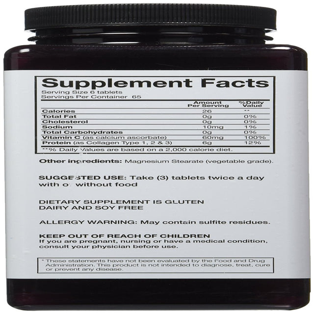 Collagen is your body's key structural protein integrally involved in creating strong and healthy nails, hair, tendons, bones, muscle, and keeping your skin smooth. During our youth, collagen helps prevent wrinkles from forming, gives skin elasticity, helps create strong and thicker hair. In our early 20's collagen diminishes by about 1% per year. By the age of 30, the signs of collagen reduction have started to become visible. And the reduction in bones and joints begins to be felt. Collagen 1 & 3 are the main collagen types in connective tissue. Vitamin C assists the body in the manufacture of collagen, the protein that binds cells together and is the building block of connective tissues throughout the body. Collagen is critical to the formation and on going health of the skin, cartilage, ligaments and other bodily tissues and structures. Collagen Type 2 is a significant part of your body's cartilage with naturally occurring hyaluronic acid for joint cushioning and lubrication. Hyaluronic acid and collagen are vital structural components of the skin. Chondroitin sulfate, also naturally occurring, may provide anti-inflammatory support. These statements have not been evaluated by the Food and Drug Administration. This product is not intended to diagnose, treat, cure or prevent any disease. Suggested Use: Take 3 tablets twice a day. Supplement Facts: Serving Size: 6 Tablets (6 Grams) Servings Per Container: 65 Amount Per Serving - % Daily Value: Calories 26 - **, Total Fat 0 g - 0%, Cholesterol 0 g - 0%, Sodium 10 mg - 1%, Total Carbohydrates 0 g - 0%, Vitamin C (as calcium ascorbate) 60 mg - 100%, Protein (Collagen Type 1, 2 & 3) 6 g - **. *Percent Daily Values are based on a 2,000 calorie diet. **No daily values established. Other Ingredients: Collagen 1, 2 & 3 (containing varying amounts of chondroitin and hyaluronic acid), Calcium Ascorbate and Magnesium Stearate.