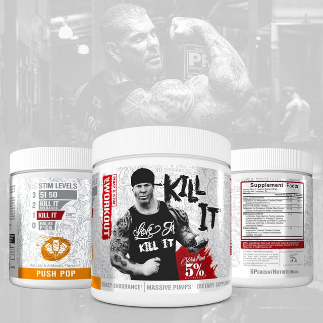 5% Nutrition Rich Piana Kill It Pre Workout Powder W/Creatine, Jitter-Free Caffeine, No-Booster, Beta Alanine, L-Citrulline for Focus, Pump, Endurance, Recovery 13.23 Oz, 30 Srvgs (Push Pop)